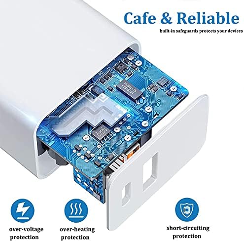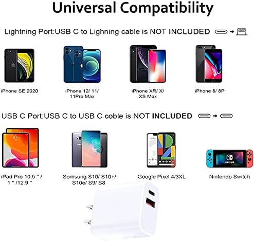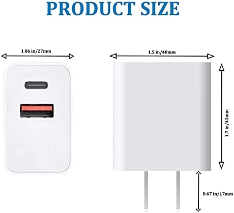 【Compact and Tiny】 USB and Type C 2 port charger, extremely compact style, seamless injection molding process, easy to carry and save certain space of your handbag or wall socket; Maximum portability for you whether you are in a home, office or vacation; The item weights only 29g, size is about 1.54in L x 1.06in W x 1.77in H.    【Ultra Compatibility】2 in 1 charger USBA and Type-C Compatible with Apple2.4,PD3.0, QC3.0/2.0,DCP,AFC,FCP, BC1.2 and other fast charging protocols.International universal 100-240V 50/60Hz voltage input, suitable for most countries and regions; It can be used with PD and QC compatible devices, including iPhone 13/13 Mini/13 Pro/13 Pro Max/11/11 Pro / 11 Pro Max/SE,AirPods Pro,Switch, 11”/12.9”iPad Pro,iPad Air (third generation), iPad Mini (fifth generation), AirPods Pro,Samsung/LG/Google etc.    【20W Total Output 4 Times Faster】 Input: 100-240v~50-60Hz 0.5A,output: 5V=3A 9V=2.22A 12V=1.67A. Total output: 20W MAX, it also smartly adjust the input power of the phone in order to prevent cell phone from overcharging and overheating, thereby maximizing battery life; Compared with original 5W charger, iPhone 12 and previous iPhone models recharging speed reaches 4 times faster.    【Automatic Temperature Control】 Charging base applies for advanced technology to improve conversion efficiency and effectively reduce heating of the charger. When temperature of the control chip is exceeds 80℃ or the NTC temperature exceeds 60℃,charging adapter will automatically stop working. The built-in protection device also protects your equipment from excessive current, overheating and overcharging.    【Multiple Protections】 The charger is made with fire-retardant and flame-retardant PC plastic which is capable of preventing autoignition when temperature is too high. At the same time, it is equipped with protection function such as overcurrent, overvoltage, short circuit, overcharge and anti-surge. Guarantee safety issues smartly during the safe use of charging.