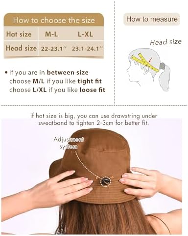 Bucket hat is made of 100% high quality washed cotton which can maintain the shape well, protect your head and prevent sun damage. The breathable material make you feel comfortable when wear it all day;This summer hat is perfect for outdoor activities and sports; Bucket hats for women comes with a velcro which can help to bring a snug fit for you,and if you feel large or small , you can adjust by it; Adjustable chin strap holds hat in place, even during windy day, and is easy to attach and detach; An inner sweatband ensure your utmost comfort; Womens bucket hat is packable and crushable ,it can throw in your beach bag or suitcase.Great for vacation,beach,travel,boating, park walking, hiking, gardening,shopping ect. FURTALK unisex sun hats have different colors, which can be matched with different styles of clothes and are suitable for daily wear.Both men and women will be very fashionable. Cotton beach bucket hat have two sizes of head circumference,adjustable with Velcro.(Size M-L: 22-23.1" ,Size L-XL: 23.1-24.1")         #21,162 in Clothing, Shoes & Jewelry ( )   #12 in