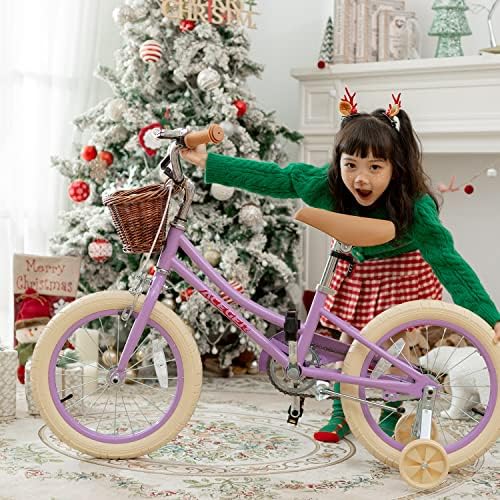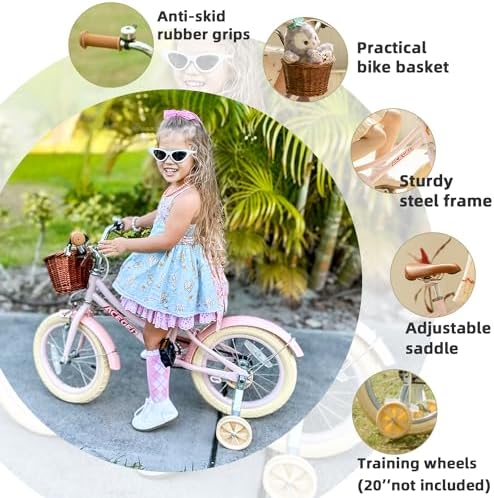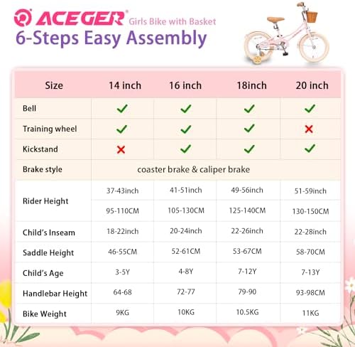 ⭐14 Inch Bike : Designed for girls ages 3-5 years, best fit for riders with an inseam of 13" to 16". The 14” bike with training wheels provides an easy transition from balance to pedal bike./16 Inch Bike : Designed for girls ages 4-8 years, best fit for riders with an inseam of 13" to 16". Teach your child to ride with kickstand instead of training wheels./20 Inch Bike : Designed for girls ages 7-13 years.It only has kickstand,no training wheels.Big Adventure for elder girls. ⭐Safety and High Quality : Lightweight but sturdy frame for safety. Optimized an air-filled tires to filter the road vibration to make riding more comfortable. ⭐Lovely Components : Soft handlebar grips, reflectors and a bell are included. The extremely cute wicker basket to let the kids pack all the stuffed animals or snacks... ⭐Easy Assembly : Includes all the tools for easy instructions. Out of the box and riding in less than 10 minutes. ⭐Assembly Attention: about pedal, LEFT pedal – rotate pedal axle ANTI-CLOCKWISE towards front of bike. RIGHT pedal – rotate axle CLOCKWISE towards front of bike. About fender, if the fender holder is too narrow, you can push it larger by yourself.