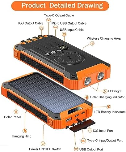 [Built-in 4 Charging Cables] This power bank is built with 3 output cables ( Type C*1 & iOS*1 & Micro USB*1) and 1 USB-A input cable. No matter output or input, you don’t need to carry charging cables. Get rid of messy cables, charge at anytime and everywhere.    [Advanced Wireless Charging] This portable charger supports advanced wireless charging, compatible with all wireless-enabled devices. Such as iPhone 14/13/12 series, Samsung Galaxy S23/S22/S21 series, etc. Put your device on the wireless charging area, it gets charged immediately. Come and enjoy your cable-free charging time.    [Power 6 Devices at Once] This solar charger is also equipped with 4 ports (iOS input, USB A output, USB C input/output), providing 5V/3A high-speed charging to save time. Along with 4 charging cables and wireless charging, it supports charging 6 devices simultaneously. Keep all your devices alive. Sharing with families and friends is perfect.    [Super Large Capacity] With 36000mAh premium Li-polymer battery, this solar power bank can charge your devices multiple times. It can be recharged via adapter and solar power, free your worries of poweroff. Equipped with smart protection IC chip, it guarantees charging safety intelligently.    [Sturdy&Durable Design for Outdoor] This solar battery pack is well made to be Waterproof/Shockproof/Dust-proof, which can withstand the harsh environment outdoors. It’s equipped with Dual super bright LED lights, a Must-Have tool for outdoor activities and home emergencies.    [Thanks for choosing us] Every GOODaaa product is certified safe and provided with a lifetime warranty. We also provide professional pre-sales and after-sales service for you. Any questions, please feel free to contact us. We promise you a satisfactory solution within 24 hours.