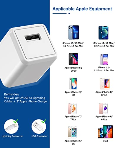 【Cube Charger Approved】USB to lightning iphone x charger cable equips with MFi chip ensures 100% flawless compatibility with devices for family members. The iphone charger free you from the worry of popping up warning messages.    【Extra Long iPhone Charger Cord】iPhone 11 charger cord 6ft certified which designed and manufactured with high-quality materials.And it is sturdy to bear 10000+ bending and convenient for usage.MFi Certified 6feet Lightning cable is efficient in charging and data transferring up to 480Mbps(30MB/S).    【2pack iPhone Charger Block and 2pack iphone charger cord】Compact and lightweight design of 5w charger is easy to carry and save space in your bag. Strict quality control ensures your devices charge safely at maximum speed!    【Original MFi Certified】 iphone charger with 6foot enough long cables for iPhone 14/14 Plus/14 Pro/14 Pro Max, iPhone13 /13 Mini /13 Pro /13 Pro Max, iPhone12 /12 Mini /12 Pro /12 Pro Max, iPhone 11 /11 Pro /11 Pro Max, iPhone X /XR /XS /XS Max, iPhone 8 / 8 Plus, iPhone 7 /7 Plus, iPhone 6S /6S Plus /6/6 Plus, iPhone 5 /5S /5C /SE, iPhone SE 2020/iPhone SE 2022,iPad, AirPods, iPod touch.    【 Hassle-Free Service 】 2* Chargers for iPhone and 2* Fast Charging Data Sync Cord(6FT).If you have any questions, don't hesitate to contact us!           #181 in