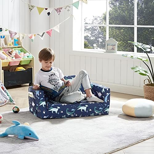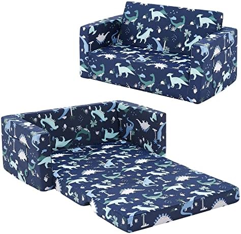 Ulax furniture Kids Fold Out Couch 2-in-1 Children Convertible Sofa to Lounger with Soft Plush Fabric(Navy Dinosaur)