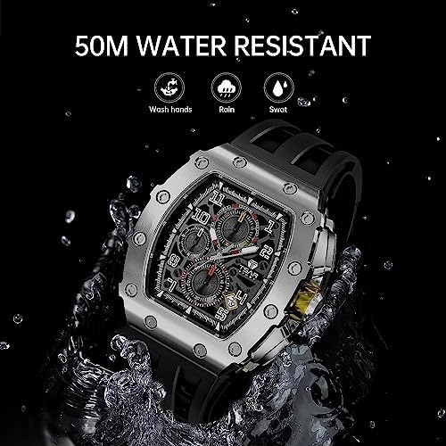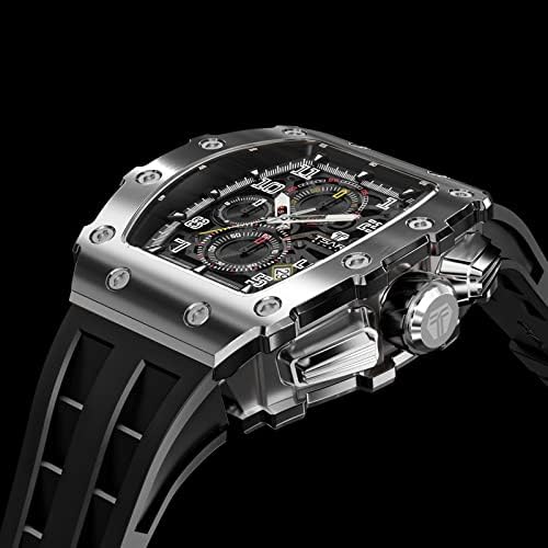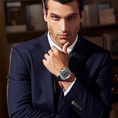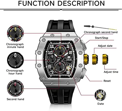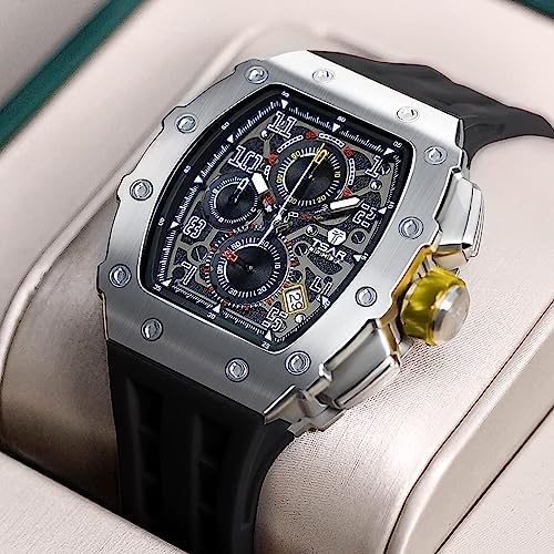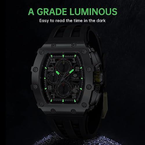 ⌚ Unique Design: The classic tonneau shape and the exterior shape of the exposed screws around the dial, together with the unique and complex design of the skeletonized dial, the crown design derived from the wheels and tire treads of a racing car, make this watch look luxurious and cool. The ergonomic double bridge design provides an extremely comfortable wearing experience, and the advanced innovative technology make this watch show the "Haute Couture" style. ⌚ Japanese Movement&Sapphire Crystal: This multifunctional chronograph watch with Imported Japanese movement, which ensures accuracy and stability. The case is made of 316L stainless steel with 202 steps processes, with high quality sapphire crystal, which has good wear resistance and visual impact. The silicone strap is soft and comfortable, and can last longer than you can imagine under normal use. ⌚ Waterproof&Luminous: TSAR BOMBA men's watch water resistance up to 50 meters/5 ATM, can easily withstand sweat, rain and splashing water, so you don't have to worry about daily water resistance. A-level super luminous function, let you read the time clearly even at night. (It can glow for 3-4 hours after absorbing enough light energy). ⌚ Ideal Gift: TSAR BOMBA watches are unique and sporty, with quality materials and excellent watchmaking craftsmanship, show your luxury temperament! Packaged in an exquisite box, this luxury watch is the ideal gift for yourself, your loved ones, friends and family for Birthday, Father's Day, Thanksgiving, etc. ⌚ CUSTOMER SATISFACTION: We provides an 90-day return policy and a 2-year after sales servive. We remain committed to providing a range of classic high quality designer men's watches and a high standard of customer service. If you have any questions about our watch for men, please contact us first and we will provide you with a satisfactory solution within 24 hours.         #1,769,543 in Clothing, Shoes & Jewelry ( )   #10,011 in
