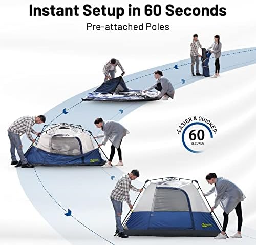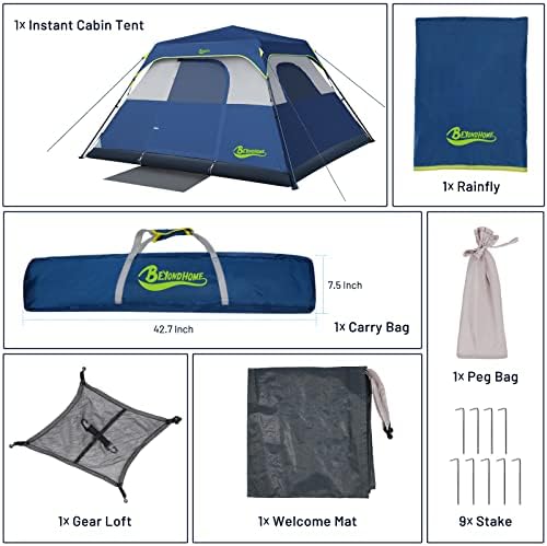 【Polyester, PE,SBS Zipper】Tip: The accessories are put together with the tent, all in the blue carry bag.    【Pick a Campsite, Pitch in Seconds】Set up the camping tent in merely 60 seconds. Our instant cabin tent is not only roomy, weather-proof, and sturdy, the installation is a breeze. The pre-attached poles collapse easily in place to ensure you are never scrambling to decipher which pole goes where. Our unique approach makes the assembly simple and intuitive. So, spend more quality time with your family or group at the campsite, taking any complex assembly out of the equation.    【Water-resistant & Windproof Everywhere】The tent is effortlessly convenient yet rugged in harsh environments. It features more steel stakes to fix the tent on the ground ensuring sturdiness, and a detachable rainfly to protect you against wind and rain. Also, the sealed seams and the unique waterproof strip make this a high-quality water-resistant tent. It is your perfect companion to remain dry and comfortable while camping in inclement climates.    【Enjoy More Airflow and Scenic Views of the Outdoors】The tent has one mesh door, 4 mesh windows, a mesh tent top, and one side-ventilation to give you plenty of airflows. So the worries about a stuffy night’s sleep go out the window. Under the rainfly, the whole tent is made of mesh which allows for exquisite stargazing on warm and dry nights and stunning views of nature.    【Spacious and Lightweight】The instant cabin camping tent is 10ft x 9ft and fits a queen-size mattress in it easily with plenty of extra space. With a peak height of 66 ", you can stand fully upright when changing clothes. The weight is only 16.75lbs, you can carry the tent to the campsite from the car easily.    【Durable & Human-centered Design】Double-thick fabric meets the Cpai-84 Flammability Requirement. The thickened protections on the upper corner of the pole avoid any puncture to the rainfly; the camp port increases the convenience if you need electricity from outside; the upgraded SBS zipper allows a smoother user experience; gear loft and pockets help keep your tent organized.    【What You Get】1x 6-person instant cabin tent, 1x rainfly, 1x carry bag, 1x gear loft, 1x welcome mat, 9x stake 1 year technical support, If you encounter other problems in use, we’ll give you a satisfied solution within 12 hours.