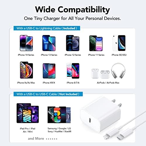 [Qwinjwin PD 3.0 Fast Charger for iPhone] iPhone Fast Charger equipped with 20W PD 3.0 USB Type C power delivery wall plug, PD 3.0 Quick-Charge USB C port provides Max 20W output power, charge your device up to 3x faster than original 5W charger,charging your iPhone 13 up to 50% in just 30 minutes, saving over 1.5hrs for you.    【Universal Compatibility】 The 20W PD phone chargers for iPhone can fast charge iPhone 14/14 plus/14 pro/14 pro max/13/13 pro/13 pro max/12/12 pro/12 pro max/12 mini/11/11 Pro/11 Pro Max/XR/XS Max/XS/X/8 Plus/8 , iPad Pro, AirPods Pro, and charge iPhone 7/7 Plus/6s/6s Plus/6/6 Plus/SE/5s/5/5c at standard speed.    [Perfect Length for Your Life ] 6.6 FT usb c to Connector cable meets your daily needs. Tangle-free 6.6FT length is convenient for usage while charging and sync at home/office/travel in bed, hotel rooms, and more.    [Safety Efficient Fast Charging] The Power Delivery Wall Charger for iPhone owns bulit-in multi-protection system, avoiding from over-voltage, over-charge, over-heat, etc. Charge your iPhone/iPad device fast, safely and steadily.    [What You Get] 2x 6.6FT Charging Cable and 2 x USB-C Wall Charger. We offer 7x24 hours friendly customer service. If you have any questions, please feel free to contact us.