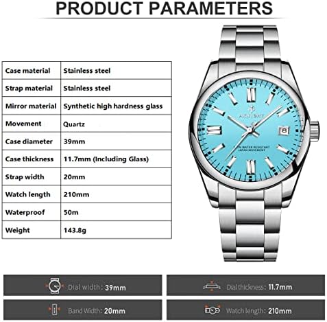 【 BLUE FACE MENS WATCH 】: AKNIGHT men's watches is a collection of classic designer silver watches for men. 100% solid glass and high quality fashionable luxury stainless steel watch with innovative hand design and unique blue dial. This watches seconds hand have the “aknight ”symbol as counter balance. 【 WATERPROOF WATCH FOR MEN】: 5ATM Water Resistant:Water resistant to 165 feet (50 m), suitable for daily use. Not suitable for bathing, swimming, diving and other water related work. This waterproof sport watch is scratch-resistant and has a smooth feel. 【 STAINLESS STEEL MEN'S WATCH】: High quality quartz movement provides more precise timekeeping and longer life. The strap is made of stainless steel, corrosion-resistant and will never fade.(Unisex, 210mm, comes with a strap link adjustment tool, you can customize the desired wrist size according to the instruction manual.) 【 PERFECT GIFT FOR MEN】: This fashion men watch blends in with every occasion be it formal or casual. Wear this watch on the go, from business, leisure to indoor and outdoor activities or for daily use. (With an exquisite gift box, AKNIGHT Watches is sure to be the perfect gift.) 【 100% SATISFACTION GUARANTEE】: We only provide quality chronograph watches, Your comfort is our top priority and we are committed to ensuring 100% customer satisfaction. If you encounter any problems during the use of the watch, please feel free to contact us.         #102,470 in Clothing, Shoes & Jewelry ( )   #338 in