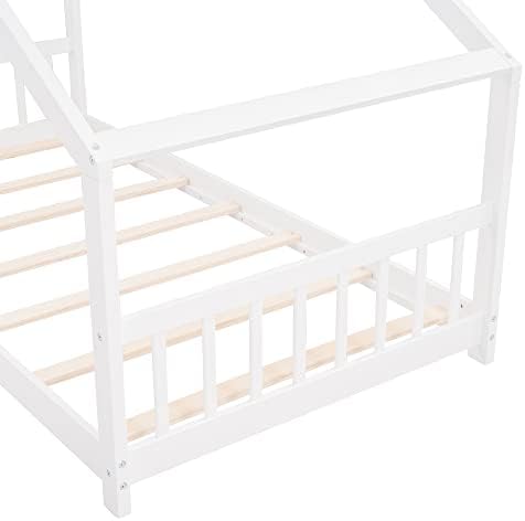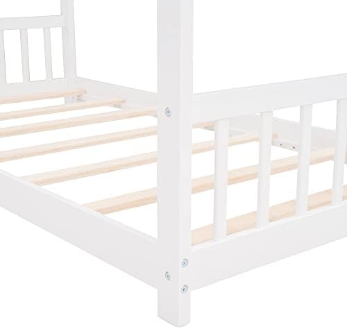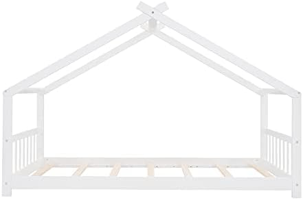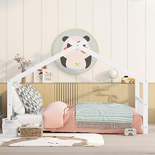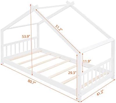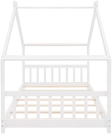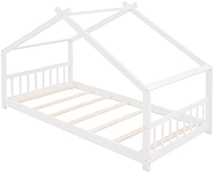 【Chic Kids House Bed】The funny house-shaped of the eaves, simple and open concept gives your creativity free reign , perfect for girls or boys to make up their own theme or to keep it beautifully simplistic. The unique and modern twin size kids bed adds charm and character to any bedroom.    【Open & Spacious Twin Bed Frame】 This open concept allows for creativity to decorate with any special piece of art.What' more ,the headboard and footboard included to provide you with a comfortable backrest while sleeping.    【Superior Quality Crafted】This house twin bed is crafted with premier quality in mind, the floor toddler bed frames made of high-quality pine wood and MDF that can enhance stability and durability. comes with wood slats for extra support and ensures air moves freely around your mattress to keep it fresh for years to come.No box spring required.    【Better Sleeping Environment】This low profile of the twin floor bed for kids which is easy to get in and out . Thanks to the semi-enclosed space, your kids will have their own sleeping space that affords a comforting atmosphere for better sleep while not sacrificing air circulation.    【Easy to Assemble】Our twin size bed frame comes with a clear and detailed assembly instruction guide and all necessary tools are provided to get your house bed frame assembled in no time.Customers’ satisfaction is our top priority, please contact us if you have any questions.