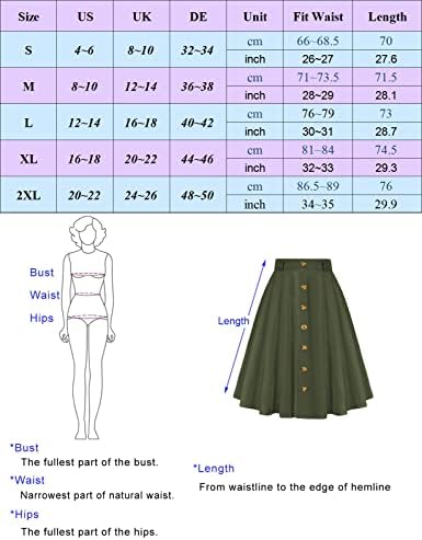 Retro Design: Vintage Skirt Features seven decorated buttons in the front, detachable belt,midi length and pockets, you can put small things like mobile phone, keys into it, high waisted, a-line design, classic solid color Spring & Summer need cute midi skirts! No matter what body type you are, this must-have skirt is a good choice for your summer. This women's skirt flows naturally when you walk and perfectly shows your personality. The A-line silhouette flatters your curves, while the belt comfortably nips you in at the waist Occasion: Simple retro solid-colored design, will never be out of date. The high waisted skirt is suitable for date, work, office, school, travel, party, cocktail, beach, vacations, Halloween, daily casual. Perfect for spring, summer, and autumn, easy to match all kinds of tops Size Guide: Small=US 4-6, Medium=US 8-10, Large=US 12-14, X-Large=US 16-18, XX-Large=US 20-22;Please choose your size according to our size chart image. We accept 30 days of free returns Garment Care: Machine washable, recommended with a laundry bag, do not bleach         #22,622 in Clothing, Shoes & Jewelry ( )   #117 in