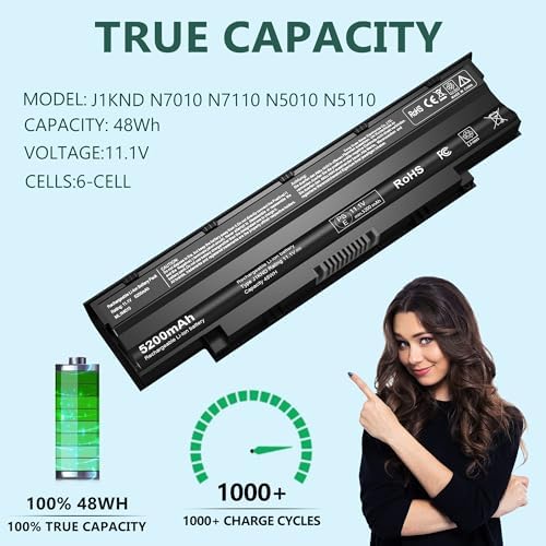 ?【Specification】Battery type: Rechargeable Li-ion Battery; Voltage: 11.1V; Capacity: 48Wh 5200mAh; Cells: 6-Cells; Color: Black,Weight: About 12.16OZ; Size: Length:8.35in Width:1.82in Height:0.80in Condition:New, Battery life: More than 1000 cycles,Packages includes: 1x J1KND battery,1x Instruction for Laptop Battery.    ?【Compatible with Dell Part Numbers】04YRJH 06P6PN 07XFJJ 312-0233 312-0234 383CW 451-11510 4T7JN 965Y7 9T48V 9TCXN FMHC10 JIKND J4XDH TKV2V W7H3N YXVK2 J1KND Dell Laptop Battery    ?【GUARANTEE】CE/ROHS Certified for Security Assurances,100% New Brand,100% Compatibility With the OEM.Note: Our J1KND Battery will improve your efficiency and prevent poor quality batteries from affecting your efficiency.    ?【COMPATIBLE MODEL】Replace for Dell Inspiron 13R N3010 N3110 Battery Dell inspiron 14R N4010 N4011 N4040 N4050 M4040 Battery Dell inspiron 15R N5010 N5011 N5020 N5030 N5040 N5050 N5110 M501 M5010 M5011 M5030 Battery Dell inspiron 17R N7010 N7011 N7110 Battery Dell Inspiron 14 3420 15 3520 Battery Dell Vostro 1440 1450 1540 1550 3450 3550 3555 3750 Series Laptop Notebook Battery    ?【IMPORTANT】Press [ Ctrl+F ] to find the laptop models. The model list is not complete, if you can't find your laptop model, please ASK a QUESTION or CONTACT US. ※24 x 7 Email Support, 12 Months warranty, 30 Days Money Back Guarantee.