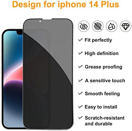 ?[Designed for iPhone 14 Plus] - Since the size of the compatible model cannot fit perfectly with the iPhone 14 Plus, Pehael's screen protector size is specially designed for iPhone 14 Plus, include 2 Pack privacy screen protectors + 2 Pack Tempered Camera Lens protectors.    ?[Full Coverage Protection] - This screen protector provides edge to edge protection for your device. Prevent dust from accumulating around the edges, leaving no space for dust. Including curved edge lines are also covered, make the phone look like it doesn't have a cover.It also protects your eyes from light, making the visual effect softer.    ?[Anti-Spy Tempered Glass] - Give your NEW iPhone better protection, choose high-quality materials to produce good screen protectors. Choose the most appropriate color depth for the anti-peep coating, while satisfying privacy and visual comfort. Hides your private and sensitive information from strangers in public places.    ?[Night Shooting Function] - Specially designed dark circle iPhone 14 Plus camera lens protector. The camera lens protector adopts the new technology of "seamless" integration of augmented reality, with light transmittance and night shooting function, without the need to design the flash hole position, when the flash is turned on at night, the original quality of photos and videos can be restored.    ?[Face ID Compatible] - Precisely cut for the iPhone 14 Plus 6.7 inch, this screen protector does not interfere with the Face ID feature. It is easy to finish the protectors by aligning the edges and the smooth feel allows you to enjoy every touch with the iPhone.