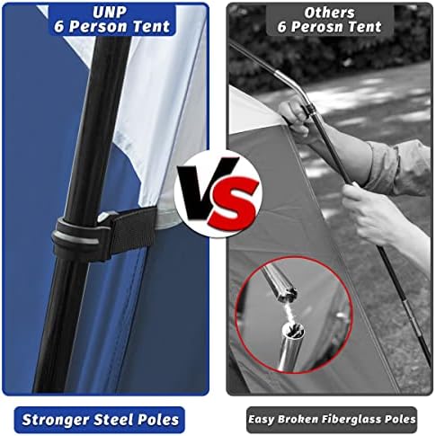 polyester    Imported    ✅【Roomy 6 People Family Tent】Spacious design offers enough room for 6 people family, with a size 10' x 9' x 78"(H) (90 sq ft),2 air mattresses or 6 sleeping bags are well fit in the tent,78inch center height is enough for you to stand up changing.    ✅【5 minutes Set-Up for 2 Person】No particular skills are needed, one person also could set up the tent easily in 10 min. The portable carry bag is 24.6 x 8.26 x 8.26 inches, The camping tent weighs 18 lb. You could carry the bag in your backpack or store it in the car easily.Ideal for family car camping or camping site    ✅【5 Breathable Mesh Windows 】The camping tent has 1 large mesh door, 5 mesh windows & mesh tent top,which allows the breeze to come in, zippered access allows campers to adjust the vents from inside the tent mesh paneling and doors offer great views and ventilation.    ✅【Durable & High-Quality Material】Made with 185T polyester. With the 1000mm polyurethane hydrostatic rated coating high-tech, waterproof,4 steel leg poles, rectangular roof, make the tent more firmly, stable, and windproof,ideal for outdoor camping, hiking, fishing in all weather.    ✅【1-Year Warranty】UNP camping tent offers unconditional 1-year quality assurance to offer you a risk-free purchase, If you have any questions about the tents,please contact us,we’ll give you a satisfied solution in 12 hrs.