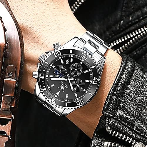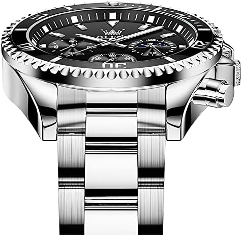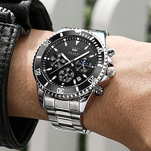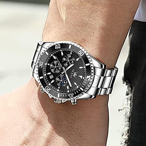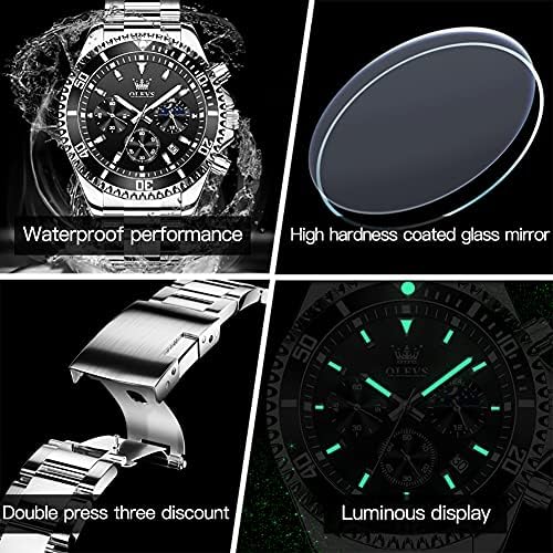 ⌚OLEVS Mens Watches: Imported Japanese quartz movement, high quality battery, analog display roman watch, accurate time,Whether in formal or casual occasions, this men Luxury Business watches is suitable for wearing. ⌚Multifunctional Chronograph Watch:Unidirectional rotating bezel,The design of stopwatch and multi-needle adds to the practicality of the watch Attractive three eye design,small dial timing display,24H display,The classic bottom moon phase window is a classic balck watch for gentleman men. ⌚Luxury Stainless Steel Strap:316L stainless steel silver strap,Solid stainless steel watch bracelet, ventilate, prevent perspiration, Free band adjustment tool,the length of the men wrist watch can be adjusted according to the size of the wrist. ⌚Luminous /Waterproof Watch for men:3ATM strong pressure waterproof, suitable for everyday life waterproofing, such as washing hands, doing housework, and briefly soaking in water.The luminous function can read the watch in the dark environment. ⌚OLEVS Moon Phase Watches:We provide 30 days free returns,2 years product high-quality assurance for the male watch.If you have problems during the use of the wristwatch,please feel free to contact us. We will offer you a professional service!
