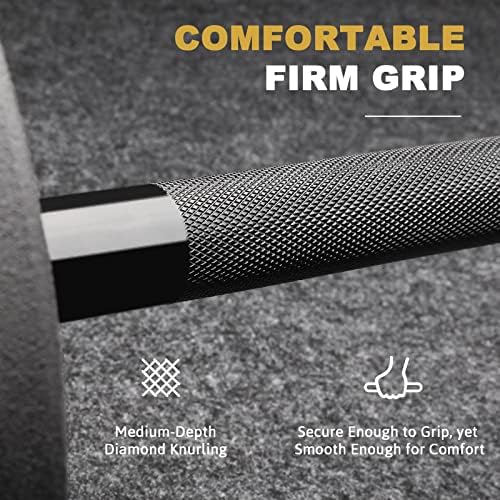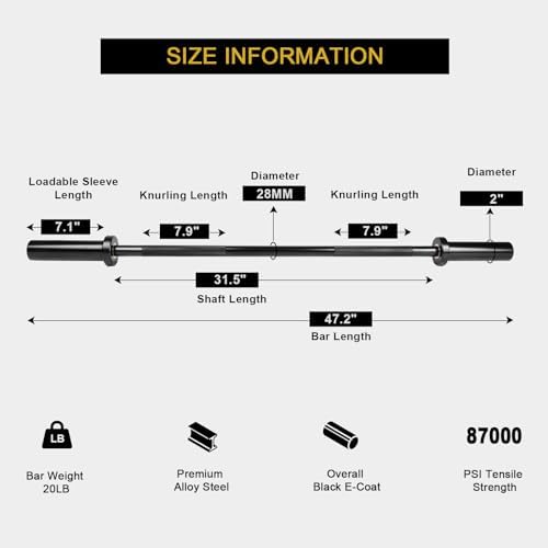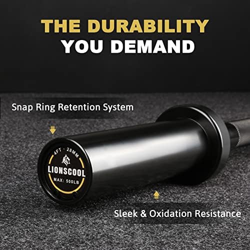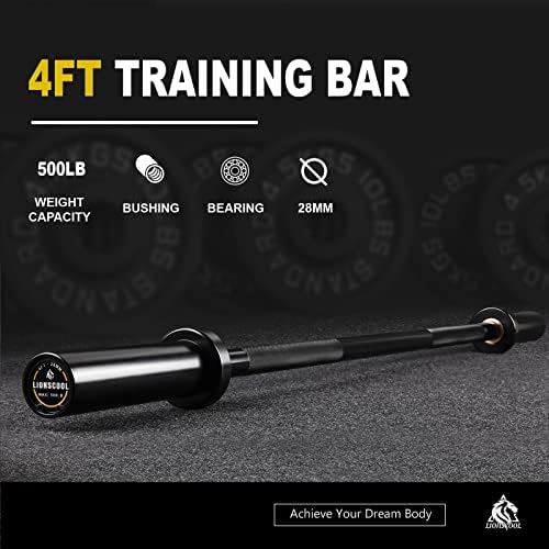Commercial Quality for Home & Gym: Made of the same material as our Olympic barbells, our heavy duty 4 ft training bar will stand the test of time. The high-quality seamless steel was heat-treated to reach the weight capacity of 500LBS. The shaft and sleeves feature a unique black E-coat finish, delivering superb corrosion and oxidation resistance over time and a look that is stylish and aesthetic in your home gym.    Outstanding Spin: Extra thick brass bushings and premium bearings in the sleeves makes for buttery smooth rotation. Snap ring retention system secure all the components of the sleeves for a lifetime. No more tightening the hex bolt end sleeves constantly.    Medium-depth Knurling Provides Better Grip Feel: 1.5mm deep diamond knurling with specially trimmed top offers enough gripping power while delivering comfortable grip feel. 28mm diameter shaft is easy to hold and one knurl mark at either side helps to place your hands at correct positions.    Specifications: Full length is 47.2” (4ft); Weighs 20LBS; 500 pounds weight capacity; 87,000 PSI tensile strength; 28mm handgrip diameter; No center knurl; No knurl marks. Shaft length is 31.5’’; Loadable sleeves are 7.1” long and 2” in diameter to fit Olympic weight plates.    Excellent Performance in All Your Workouts: It is perfect for daily strength training and bodybuilding exercises that can be performed without the need of a power cage - bicep curls, upright rows, bent over rows, deadlifts, presses, hip thrusts, HIIT workouts, etc. Also, with its sleek all-black design, it is a gorgeous equipment for limited space home gym.    Buy with Trust in LIONSCOOL: We trust the durability and strength of our barbell so much that we provide a LIFETIME WARRANTY against bending on our barbells, and we always stand by the quality of our products and offer excellent customer service you expect. Just buy with confidence! The bar also comes with a workout poster. Spring collars are not included. It is definitely the “Bang for Buck” bar for sure.
