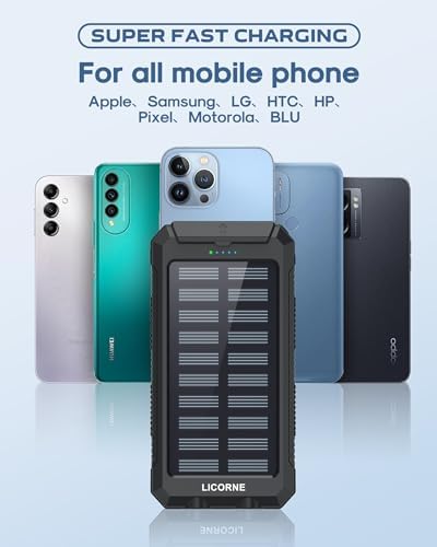 【30000mAh Large Capacity】Built-in industry-leading high-density lithium polymer cells without changing the volume and weight. The super battery life can support thousands of charge cycles.    【66W Fast-Charging Power bank】 The powerful configuration of QC3.0 fast charging 5V3.1A can quickly fill your device. Supports 66W fast charging, save your charging time.    【Dual USB Outport and Powerful LED Light】Makes it easy to charge two smartphones simultaneously or a tablet at full speed. 2 led lights can be used as flashlight. Five pilot indicators show the status of battery charger timely. Green light on when charging by solar, blue light on when USB charging.    【IPX67 Waterproof & Safe Material】 The outer case is made from flame-retardant ABS+PC material. The IPX67 waterproof silicone better protects the internal structure of the charger. comfortable touch, and exquisite appearance.    【Multi-Purpose Outdoor Power Bank】LICORNE portable solar charger is made IPX67 waterproof. The built-in dual super bright flashlight and the included compass carabiner, are the ideal companion for outdoor enthusiasts.