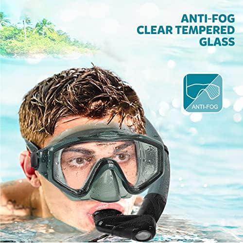 【Wide View Mask】 Ready to explore the underwater world? Our prescription snorkel mask is the perfect fit for any snorkeling enthusiast who never wants to miss out on the beauty of marine life and new landscapes. With its 180-degree vision and tempered glass that prevents fogging, you can witness the underwater world without any hindrance. This mask also features anti-leak technology, making it perfect for both photography and exploration. So, get ready for a new adventure and dive in!    【Easy-Breath Dry Top Snorkel】 If you're into exploring marine life, you need to get your hands on a full dry top snorkel. It's got a special tube design that lets you keep your head underwater while breathing air from the surface. The tube has a valve that automatically opens when it's above the water and closes as it goes under. Plus, it's made in one piece for better air flow and easier breathing. Perfect for both beginners and experienced divers.    【Comfortable Fit and Leak Proof Skirt】: Experience the ultimate snorkeling adventure with KUYOU Snorkeling Gear! Our durable snorkeling mask features a soft ergonomic skirt that fits your face contours perfectly, ensuring maximum comfort while underwater. The adjustable silicone strap lets you customize the fit to suit all face shapes. You can trust our snorkeling gear to prioritize your safety while providing the perfect fit for all who love snorkeling.    【Easy to Use and Details】 This snorkeling gear is an easy-to-maintain set with a simple design. The snorkel mask weighs 0.47lbs, and the snorkel tube is 0.29lbs. The mask is 17.7cm/7 inches long and 11.5cm/4.5 inches wide, while the snorkel tube is 37.7cm/14.8 inches long. This gear is great for casual snorkeling, family swim trips, and exploring shoals.    【Ideal for Snorkelers】: This Snorkeling Gear is perfect for both beginners and advanced snorkelers. It offers a comfortable and safe snorkeling experience and is suitable for all ages. Plus, the mask and snorkel tube come in recyclable, sturdy plastic bags that you can easily pack in your travel bag.