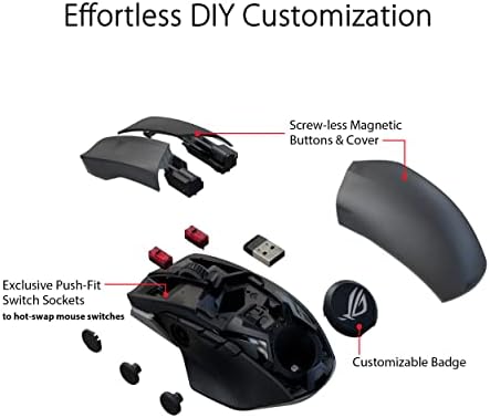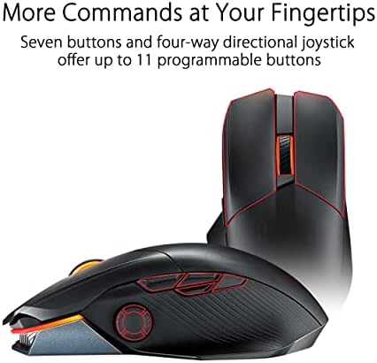 ROG AimPoint optical sensor: Next-gen 36,000 dpi sensor with 8000 Hz polling rate for ultimate precision    Tri-mode connectivity: Flexibility with wired USB, low-latency 2.4 GHz RF, plus a Bluetooth mode to pair up to three devices    Programmable joystick: New detachable joystick available in different sizes for refined analog or digital linear controls    More control at your fingertips: Seven buttons and four-way directional joystick offer a total of 11 programmable buttons for versatile hotkey functions    Instantaneous DPI adjustments: DPI On-the-Scroll enables effortless on-the-fly in-game adjustments    Push-Fit Switch Socket II: Hot-swap compatibility with 3-pin mechanical switches and 5-pin optical micro switches enable variable click force and extend lifespan    Smooth and fast movement: Soft ROG Paracord and 100% PTFE mouse feet ensure fluid glide