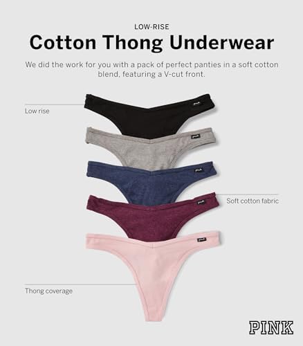 Pick a pack of perfect women's panties in a soft cotton blend, featuring a mid rise design. These thong panties have no back coverage: Designed to reduce panty lines. This mid rise thong underwear pack features an elastic waistband that moves with you. This women's underwear is made of breathable cotton that offers comfort during all day wear. Our Victoria's Secret PINK panty collection comes in a variety of prints and colors to find a style that you love.         #24,563 in Clothing, Shoes & Jewelry ( )   #69 in