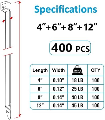 4 Diff Sizes: 4", 18 lb | 6", 25 lb | 8", 40 lb | 12", 45 lb. 400 Pack: 4", 100 Pack | 6", 100 Pack | 8", 100 Pack | 12", 100 Pack. Multi-purpose Use: Multiple sizes and tensile strength are suitable for various situations. Indoor & Outdoor: Perfect for home, office, garden, garage, organizing electrical wires, hanging lights, attaching fences, etc. Warranty: Customer will receive a 100% refund if any quality issue.