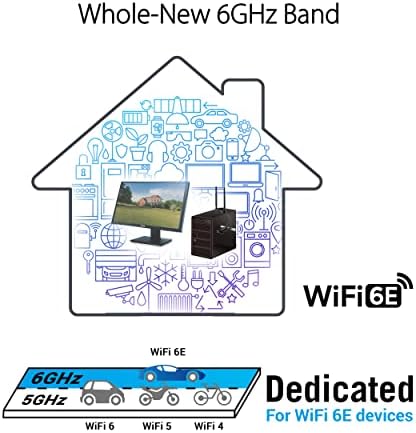 ASUS WiFi 6E total solution - optimized capabilities and performance All-new 6 GHz band - Less congestion and interference for WiFi connections Latest Bluetooth 5.2 - improved signal range, faster transmit speeds and less interference Ultrafast WiFi 6 & WiFi 6E – 4.6X faster speeds, improved connection efficiency and better network security Reduced dead zones with external antenna - Freestanding transceiver and connecting cable allows easy positioning for the best reception