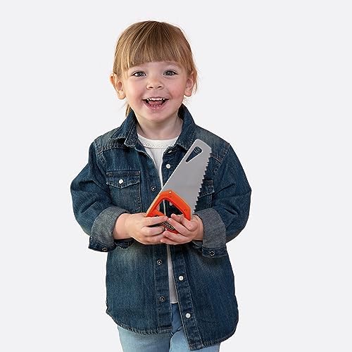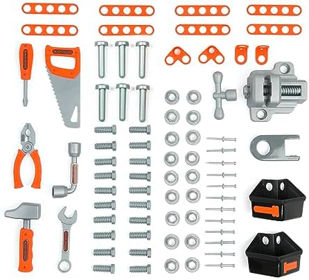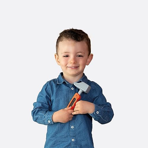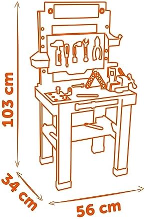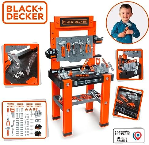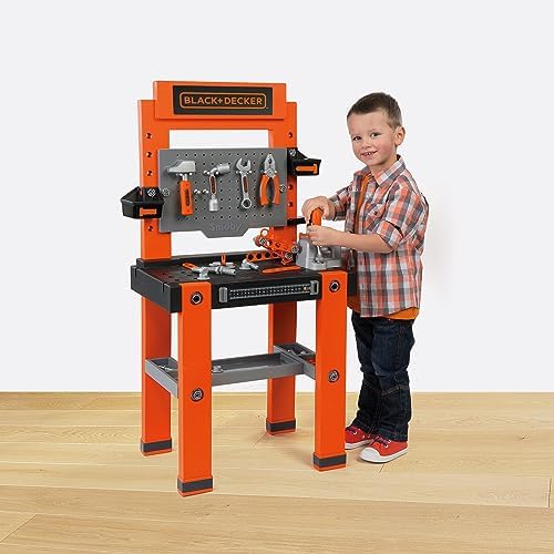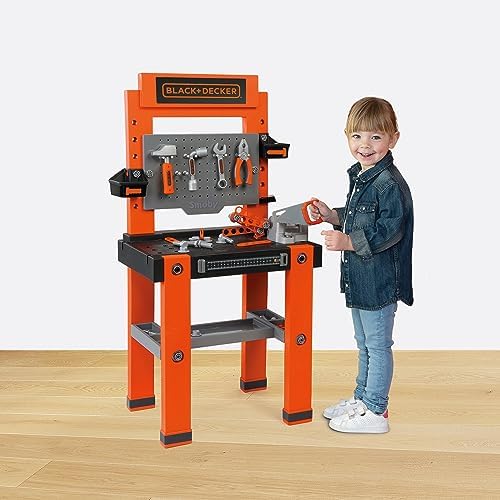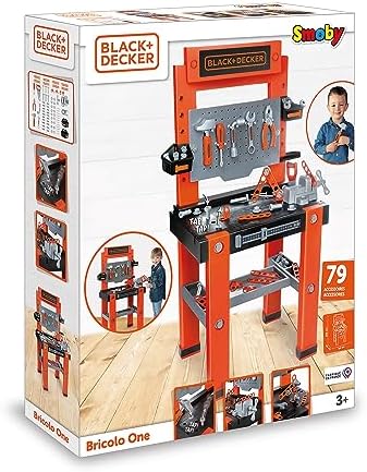Sturdy Black+Decker workbench imitating dad's workbench. Realistic details such as structures and a host of accessories make this workshop the star in every child's room    Learning by playing: Thanks to the tools and accessories, the little ones learn how and what everything is used for    The Bricolo One Black+Decker Workbench comes perfectly equipped: 7 different tools provide realistic "handyman" fun: hammer, screwdriver, pliers, wrench, Allen wrench, a press, and an adjustable ruler on the front    The numerous screws and nails can be easily stored in the multiple large and small compartments, so that everything stays tidy even after use    Assembled dimensions (L x W x H): 56 x 34 x 103 cm.    Made in France. Ages 3 and up