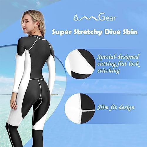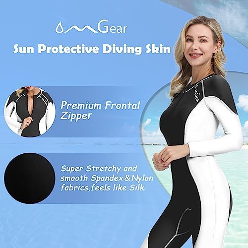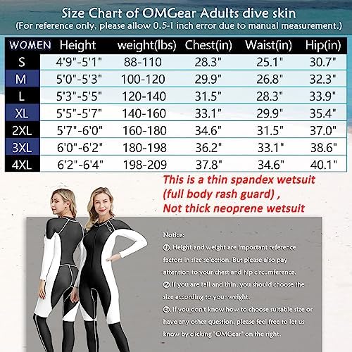 【Super Stretchy Spandex Fabrics】:OMGear full coverage swimsuit are made by 80% nylon and 20% spandex,which is super stretchy and breathable.Unlike wetsuit made by neoprene,material of this diving suit is thin and quick-dry.It is durable,quick-dry and comfortable for a long service life.    【Full Body UV Protection】:OMGear full piece rash guard is made by fabrics with UPF 50+ coating ,so it is UV protection,can protect your skin from sun burning.In addition,OMGear full body snorkeling suit can protect you from jellyfish,coral reef,or other oceanic irritants.Though it is not same thermal as the neoprene wet suit,but somewhat this thin dive suit can keep you warm.    【Slim Fit and Front Zipper Dive Skins】:Slim fit swimwear is close to your skin,feel like a second skin, naturally form fitting to reduce drag in the water, offers no restrict movement ensures you freely move underwater. OMGear full swimming suit with long front zipper is easy to put on and take off, perfect for using in swimming pool,river,lake,sea and beach.    【Must Haves for Watersports】:A sun-resistant stretchy full body dive skin is perfect for swimming ,kayaking ,surfing ,snorkeling, scuba diving, freediving, boating ,spearfishing, sailing, wakeboarding, paddling ,canoeing, rafting, jet skiing, river trekking ,fishing, beach, boardboarding, lobstering, crabfishing, whitewater and other watersports or outdoors activities.    【Satisfaction Policy】:Every OMGear full body long sleeve surfing rash guard are under strict QC standard before shipment. Please contact OMGear after-sales service team if you have any issues with this diving skin, we will reply you ASAP. We promise we will provide a 100% satisfactory solution for you.