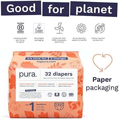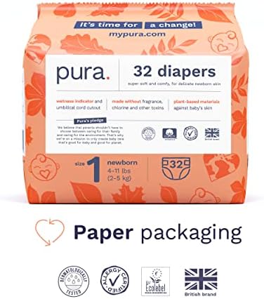 GOOD FOR BABIES: Totally Chlorine Free (TCF) Super soft and comfy, our diapers are enhanced with organic cotton, perfect for delicate newborn skin. With only plant-based materials against your baby’s bottom, our dermatologically tested, allergy-certified diapers are made without fragrance, chlorine bleaching, lotion, parabens, natural rubber latex and phthalates.    PERFECT FOR NEWBORNS: Our diapers feature a special umbilical cord cut-out, contoured to protect the delicate belly area. They also feature a handy color-changing wetness indicator, so you know when it’s time for a diaper change!    GOOD FOR THE PLANET: Pura’s EU EcoLabel accredited diapers are manufactured in a carbon neutral plant, powered by green electricity. Where possible, we’ve replaced non-sustainable materials with lower impact materials such as wood pulp from sustainably managed forests in the absorbent core of our diapers. Our packaging is made from paper, so it's easier to recycle!    TRUSTED BY PARENTS: Made in the EU to the highest standards, Pura diapers have won multiple awards, voted for by real parents.    USING BUSINESS FOR GOOD: Pura is a certified B-Corp and a Carbon Neutral business.           #216 in Baby ( )   #16 in   #236 in