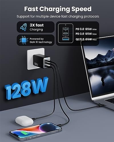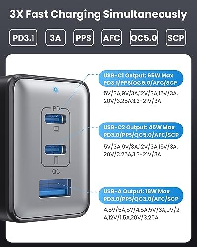 【Newly Upgraded 3-in-1 Charger】Pxwaxpy Multi-function USB wall charger power supplies an input voltage of 100-240 volts. The charging station includes 2 USB-C ports and 1 USB-A ports to charge multiple devices, such as laptops, cellular phones,tablets,headphones, smartwatches, Swtich etc. (PS:When multiple devices are connected, the charger needs to select the correct fast charging protocol and will disconnect 2-3 times before entering fast charging as a safety measure.)    【Efficient Charging & Wide Compatibility】This 3 Port GaN III charger is able to charge 1 laptops and 2 smartphones/tablets at the same time. All ports support (quick charge) agreement, it’s compatible for MacBook Pro/Air, iPhone 15, iPhone 14 or previous models, iPad Pro/Air, Galaxy S10 or previous models, Google Pixel, Dell XPS, Switch, and more.    【Latest GAN III Chip Technology】 The USB C charger adopted GaN III generation chip technology, built-in multi-protection system and premium microchips. With higher energy efficiency and upgraded heat dissipation, Gallium Nitride (GaN) makes our chargers smaller and safer without sacrificing a drop of power. Built-in overcharge protection, overheating protection, short circuit protection, over-current protection, over-voltage protection. (Note: Cable is not included)    【Ultra 3X Fast Charging 】Usb c charger deliver the optimal power output to charge different device at full speed. 1.2 hours to fully charge your MacBook Pro 13”, and compatible with all USB-C laptops. Also compatible with Apple 20W PD and Samsung PPS 45W fast charging, charging iPhone 14 to 50% in half an hour, three times faster than the original 5W charger. The size of wall charger is 2.5*1.1*1.5in and a weight of only 5.1 oz, which is 50% smaller than a normal charger.    【Small & Portable Design】Pxwaxpy USB C wall charger only needs 1 plug to keep your electronic multiple devices charged without taking several bulky charger during the journey. The usb charging station with the ultra-compact, round edge design, and foldable prongs for extra portability, and to avoid scratching other objects in your bag. We have complete warranty service if for any reason, just contact us and we will resolve all quality-related issues by replacement or refund.