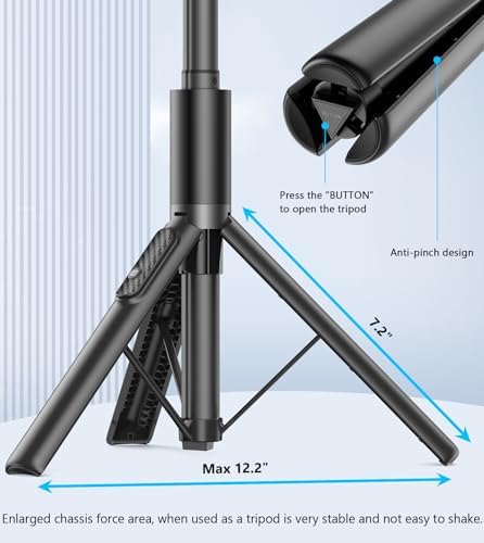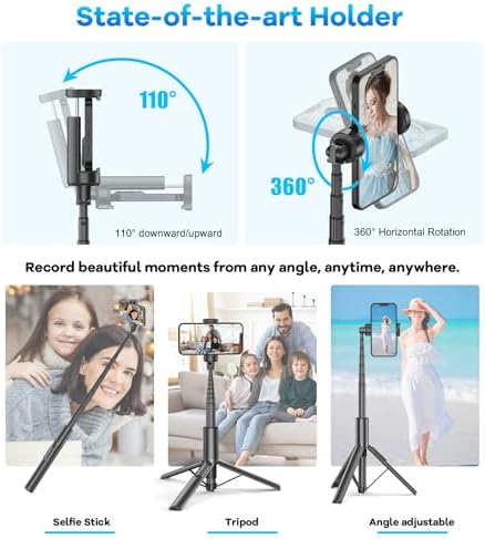 【Unlimited 360° rotation】 Gahenwo tripod for iphone can be rotated 360°, support top down, back up, horizontal and vertical screen rotation, free photo angle to meet your daily shooting needs. The cell phone holder can support phones with a width of 2.16in-3.46in (screen size of 4-7 inches), compatible with almost all cell phones. Built-in anti-slip pads to protect your phone from falling.    【Portable All-in-1 Design】 Unlike traditional phone tripod stand, Gahenwo Multi-Function Selfie Stick Tripod with Integrated Design, 8-section retractable pole and collapsible legs allow complete storage as a tube up to 11 inches (28cm) long. Beautiful and stylish while compact design is easy to carry without taking up space, is a good companion for outdoor travel.    【Stable Tripod】 The phone tripod utilizes the principle of triangular stability, while increasing the chassis force area, increasing the moment of force, When it is used as a tripod it can be very stable and not easy to shake. One button unlock tripod design, it does not require complicated assembly, just press the BUTTON button at the bottom to unlock the tripod easily. The tripod is equipped with anti-slip pads for greater stability when unfolded.    【Selfie Stick Tripod with Remote】Equipped with a 50 mAh long-lasting rechargeable remote control, which is IOS/Android compatible and is capable of 10-meter remote selfies with a simple Bluetooth connection. The remote control is embedded removable design, simple to take out, it can also be mounted on a tripod leg when it is not needed to prevent loss.    【Stretchable and Comfortable】This iPhone selfie stick is designed with an 8-section aluminum alloy material telescopic pole, the longest can be stretched up to 60 inches so that you can freely adjust the height (length) to capture a wider view. Suitable for selfies, videos, live streaming, group photos and more.