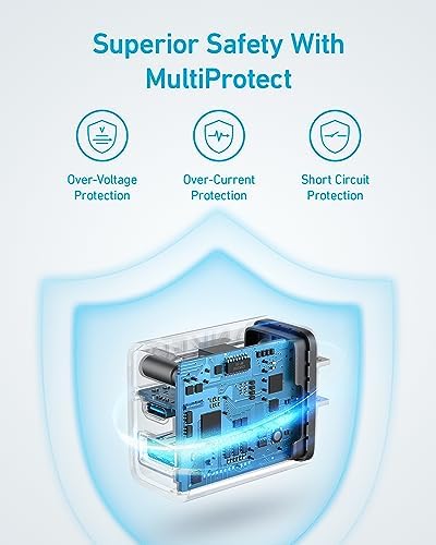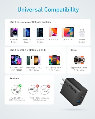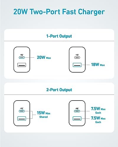 20W High-Speed Charging: Enjoy fast charging with 20W max output for your iPhone, Samsung phones, and other devices.    Simultaneous Dual-Port Charging: With the ability to use USB-C and USB-A ports simultaneously, power two devices at once without compromising speed or performance.    Small and Compact: Designed with portability in mind, take the compact charger with you wherever you go, ensuring that you never run out of power when you need it the most.    Safety First: Rest easy knowing that Anker's MultiProtect safety system offers comprehensive protection for your devices, giving you peace of mind while charging.    What You Get: Anker Charger (2-Port, 20W), 2-pack 5 ft USB-C to USB-C cable, welcome guide, 18-month warranty, and our friendly customer service.