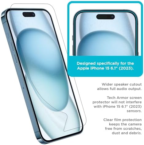 ULTIMATE SCREEN PROTECTION - Keep your iPhone 15 6.1-inch display protected from scratches, fingerprints, and smudges with Tech Armor's HD Clear Film Screen Protector.    CLEAR VISIBILITY - Enjoy crystal clear visibility with this ultra-clear screen protector that won't hinder your phone's display quality.    SENSITIVE TOUCH - This screen protector allows for full touchscreen sensitivity, so you can use your phone as you normally would.    GREAT VALUE - This pack includes four screen protectors, so you'll always have a spare on hand. Share with family and friends or keep extras for yourself.    EASY TO REMOVE - When it's time to replace your screen protector, simply peel it off - no sticky residue left behind!    LIMITED LIFETIME WARRANTY - Trust in our device protection expertise with our limited lifetime warranty. We ensure that you are covered in the unlikely event that your product fails.