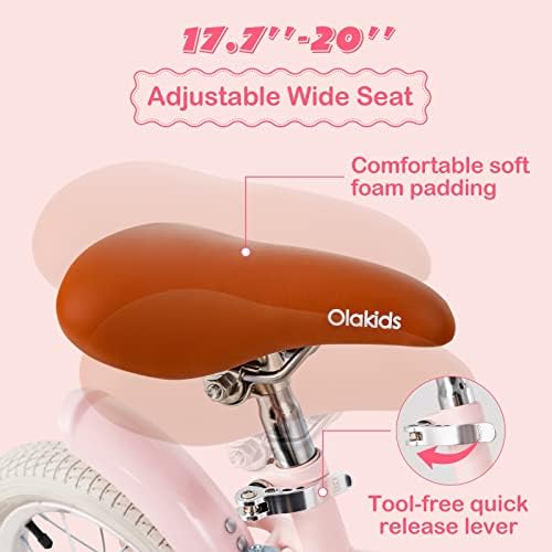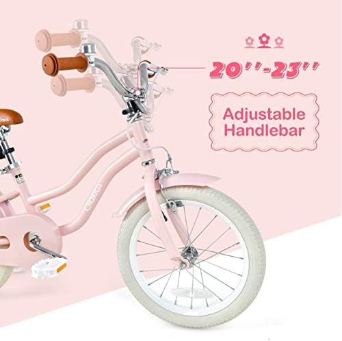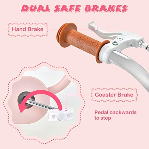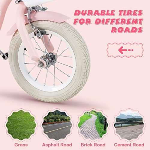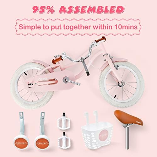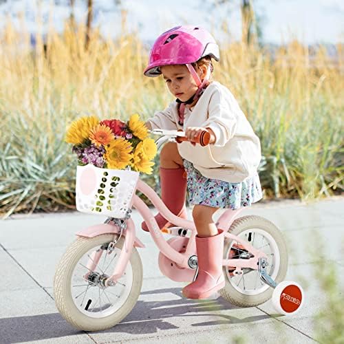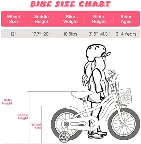 ?Grow up with Beginning Riders: This 12 inch girls bike is perfect for beginners with the detachable training wheels. The height of the saddle can be adjusted between 17.5’’ and 20’’ to meet different growth stage needs of children. The handlebar height is also adjustable from 20’’ to 23’’.    ?Safety Takes First Priority: Equipped with hand brake and rear coaster brake, the toddler pink bike with training wheels is safer for young riders to control. The enclosed chain guard prevents kids getting hurt. The safety bell on the right handle can let others know she's on the move.    ?High-quality & Durable Material: Made of sturdy steel frame, this little girls bicycle is durable and strong for long term use. Comfortable soft foam seat and TPR handles offer kids pleasing riding experience. And the widen rubber pneumatic tires are suitable for different terrains.    ?Ideal Gift for Girls: This toddler girl bike can help kids not only improve children's physical fitness and balance control, but also strengthen the courage and confidence. The removable basket and pretty appearance design add more joy to the ride.    ?95% Pre-installed for Easy Assembly: The bicycle for girls has been 95% assembled in the package. The detailed assembly instruction and required tools are also in the box. This bike for kids can be quickly installed within 10mins.    ?US. CPSIA & ASTM Approved: Made of non-toxic material without any odor, FREE from BPA, PVC, Phthalates, Lead, Latex, and Formaldehyde. No sharp points or edge. Passed the tests of stability, asphyxiation, load and shear.
