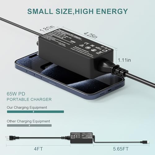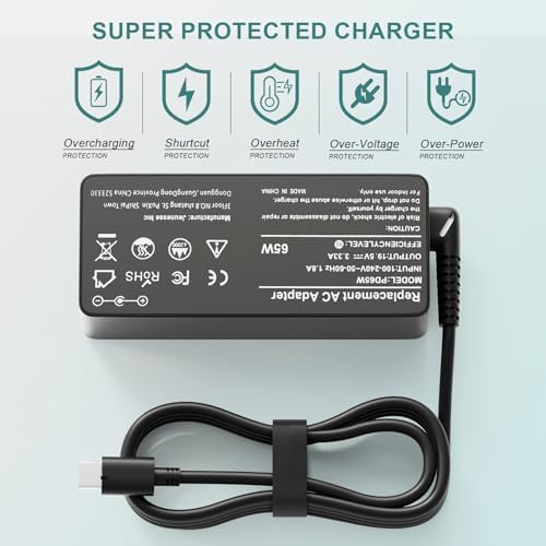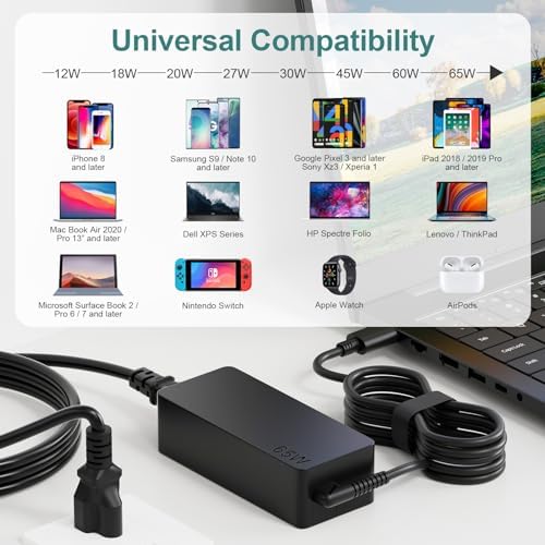 【Specifications】 Input:100-240V~50-60Hz 1.8A,Watt:65.0W(Compatible with 45 Watt ) Output:5V-3A 9V-3A 12V- 3A 15V-3A 18V-2.5A 20V-3.25A USB Type-C(USB-C)Laptop Charger.    Compatible with Dell Latitude 5420 5520 5175 5540 5320 5285 7200 7400 e5420 7420 5330 5289 5400 7370 7310 7410 5290 5530 7530 7390 7275 5430 7320 7330 charger.    Compatible with Dell Chromebook 3100 3500 3400 7486 3380 5300 7200 3300 5190 5400 7300 P28T P86F P101G P111G P28T002 P99G P29T. Dell XPS 13 9305 9365 2in1 9310 9300 9370 9380;XPS 12 9250 Dell 65w usb c charger.    Compatible with Dell P/N:HA65NM170 LA65NM170 DA65NM170 LA65NM190 LA45NM171 DA45NM170 DA30NM150 HA45NM170 DA65NM190 LA45NM150 AA45NM150 HA30NM150 HA45NM180 0M1WCF 08XTW5 D0KFY 04RYWW 0HDCY5 ADP-30CD 02CR08 8XTW5 2YKOF HDCY5 DA65NM190 24YNH JT9DM 0JYJNW 470-ABSF 492-BBUU 492-BBWZ 02YKOF    You will get 1*adapter, 1*power cord. As well as a 30-day return or exchange and a one-year warranty.