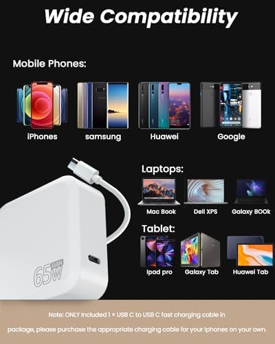 【SPECIFICATIONS】- Samsung laptop charger type c; Input Voltage: Worldwide 100-240V, 50 - 60Hz. Output Voltage: 5V~3A / 9V~3A / 12V~5A / 15V~4.33A / 20V~3.25A; Connector Size:USBC(Type-C) port,Watt:65W 45W; Compatible samsung computer charger within 65 watt. If you are not sure your laptop tip size, Please send your laptop brand and model number to us before buying;    【LATEST GAN III TECHNOLOGY】- Samsung Galaxy Book charger with GaN (Gallium Nitride) technology, charging efficiency up to 90%, chromebook laptop Gan charger is smaller in size and maximises charging speed, 60% smaller than other 65W/45W USB C chargers, perfect for charging your laptop, mobile phone or tablet while travelling.    【COMPATIBILITY】- Samsung laptop charger Fit for Galaxy Book Pro 360 15.6"NP950QDB-KB2US NP950QDB-KA2US NP950QDB-KB1US NP950QDB-KA1US Galaxy Book Pro 360 13.3 NP930QDB-KE2US NP930QDB-KD1US NP935QDC-KE1US NP930QDB-KE1US NP950QDB-KA3US NP950QDB-KB4US NP930QDB-KE4US Galaxy Book Pro 15.6" NP950XDB-KB2US NP950XDB-KA2US NP950XDB-KB1US NP950XDB-KA1US Galaxy Book Pro 13.3 NP930XDB-KE2US NP930XDB-KD2US NP930XDB-KE1US NP930XDB-KD1US Laptop Charger Type c    【COMPATIBILITY】- Samsung chromebook charger for Samsung Chromebook 4: XE310XBA XE310XBA-K01US XE310XBA-K02US XE310XBA-K03US XE310XBA-K012 XE310XBA-KD1US XE310XBA-KC1US,Chromebook 4+ XE350XBA XE350XBA-K01US XE350XBA-K02US XE350XBA-K03US XE350XBA-K05US. Samsung Chromebook Pro XE510C24 XE513C24 XE513C24-K01US XE521QAB,Chromebook Plus XE513C24-K01US xe521qab-k02,Chromebook Plus V2 XE520QAB XE520QAB-K01US XE520QAB-K02US XE520QAB-K03US XE521QAB XE525QBB,Chromebook Plus LTE XE525QBB-K01US,W16-030N1    【Customer Service】- UL-/FCC-/ROHS-Certified for safety, 65W Samsung USB C Charger, 6ft / 1.8 m USB-C to USB-C cable, our worry-free 12-month warranty, and friendly customer service. please feel free to contact us via Q&A and email and we will be here to help you, happy shopping!
