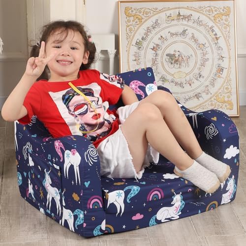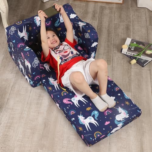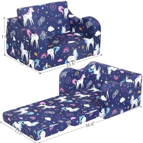 Rainbow Unicorn Printed: Add a touch of charm and enchantment to kids' freedom space with our so-soft kids sofa featuring magical unicorns.    Kids Friendly Design: The comfy kids chair is lightweight for kids to move to any room they want, whether its reading, playing video games, watching tv, or just relaxing, children can play with this sofa as they please.    Kids Convertible Sofa: The Kids Chairs is perfect for kids sitting and reading or watching their favortie cartoon. During nap time this sofa chair folds out into a comfy nap pad.    Toddler Couch Safety and Reliability: The kids sofa chair is made of durable soft polyester that is easy to clean and is filled with premium foam to support kid's body. The sofa is designed with safety in mind, as there are no sharp corners or hard edges.