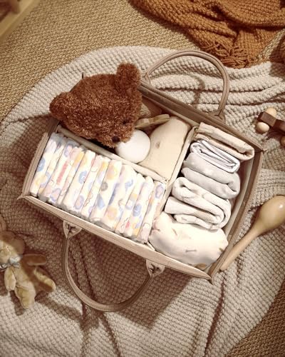 Orgnanize Your Diaper Essential - This diaper caddy organizer is extremely versatile with room for all your baby necessities in one place.Store your baby’s nappies, wipes, bibs, creams, toys, swaddles, spare clothes and more baby stuff. Cuts changing time down having everything right at hand, so you don't have to search for where the diaper and wipes were left.    Diaper Caddy with Handles and Removable Dividers - The handles make it easy to carry from room to room or carry it around to anywhere all baby essentials are needed. Moreover, it is equipped with removable dividers, enabling you to freely adjust the internal layout as needed to meet the storage needs of different items and keep it neat and organized.    Versatile Baby Caddy - Portable and practical nappy caddy basket fit for different stages of baby and this Organizer will be great to come in the nursery, bathroom, living room and car. With multiple compartments, you can easily store all of your breast pump and breast pump parts, also use it as a car organizer.    Stylish Diaper Caddy Organizer -The specially added neutral mocha brown colour and trendy design adds great style for your changing table station or anywhere in your nursery or family room.It is one of the newborns registry must haves and will make your parenting life easier.    A Unique Baby Shower Gift - The baby diaper basket is not only practical, also looks fashionable. You could fill it with mom and baby essentials to make it an extra special present for any new mom or mom-to-be. A perfect Baby Shower gift that would help her be carefree in managing the baby's duties.