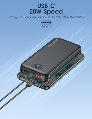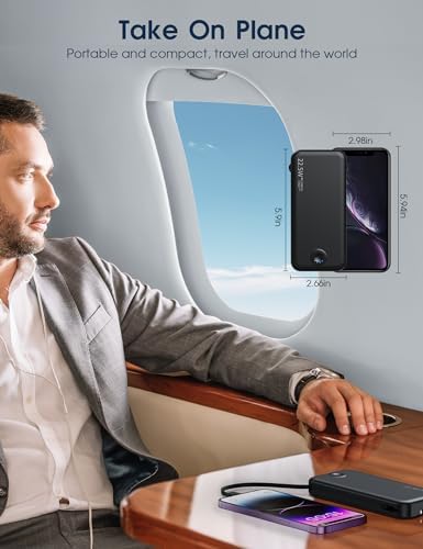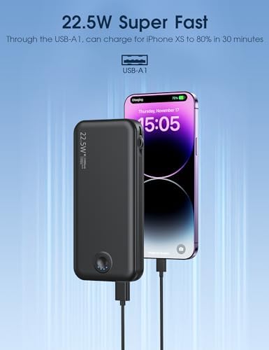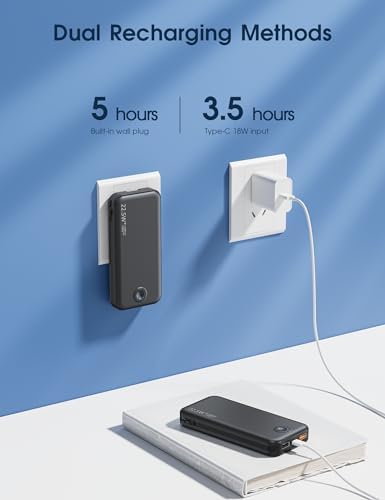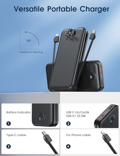 Portable Power Bank Comprehensive: This charging bank built-in USB C and for iPhone cables, top up your iPhone Android cell phones easily. The AC Wall plug allows you to recharge the portable charger directly from 100-240V wall socket, no need extra adapter, cords wherever you go.    Powerful and Compact: The 12000mAh large capacity can provide 2.2 charges for iPhone 11 Pro Max, 1.6 charges for Google Pixel 7 Pro, 1 charge for 12.9" Tablet Pro. Battery pack dimension is 5.90 x 2.66 x 0.78 in, lightweight 0.50 Lb, convenient to take with and would not be a burden for you.    Super Fast Charging: External charger has two USB-A and 1 USB C ports, capable charge 5 devices sync. The USB-A1 give 22.5W high speed delivering, charge for iPhone 12 from 0% to 75% in 30 minutes, USB C refill Google Pixel 6 Pro to 55% within 45 minutes by the 20W power.    Steady Recharge: Need 5 hours to charge through wall and just need 3.5 hours by the 20W above fast charge cord, all-around intelligent chip protect the battery bank from short circuit, over charging, regardless of which way you choose, you can keep the power pack full of energy all the daily life.    Packing List: 1x 12000mAh portable charger, 1x Type-C charge cord, 1x user manual, we have promptly 7 Day/ 24H friendly customer service, please don’t hesitate to contact us if you have any questions, we will solve it within 12H, have a pleasant outdoor activity or travel with our portable battery charger.