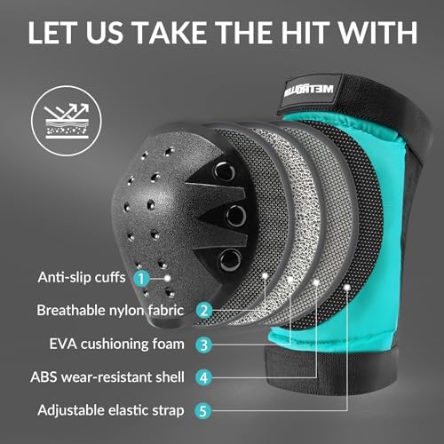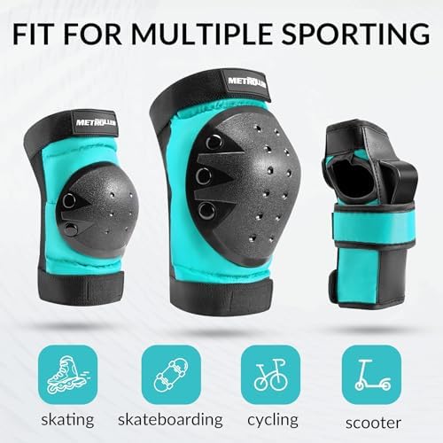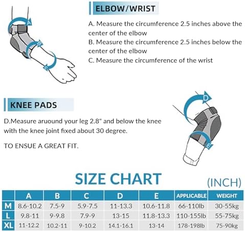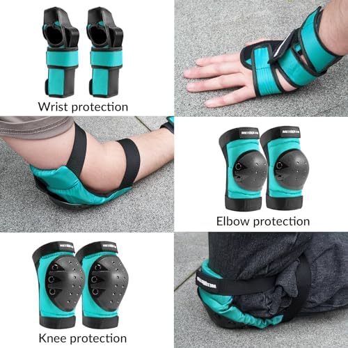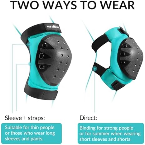 STURDY & PROTACTIVE MATERIAL Made of sturdy, soft EVA padding and tough plastic sheeting, with longer and larger pads and multiple layers of protection to ensure safety during sports and games.    EASY TO CARRY The 6-in-1 protective set includes knee pads, elbow pads, and wrist guards. The protective gear set can be carried in a mesh bag when playing sports indoors or outdoors. It can be taken anywhere due to the lightweight and convenience.    TWO WAYS TO WEAR Adjustable Velcro and elastic bands provide two ways of wearing. Direct binding for strong people or for summer when wearing short sleeves and shorts.Sleeves + straps. Suitable for thin people or wear long sleeves and pants.    FIT FOR MULTIPLE SPORTING The protective gear set can be used with roller skating, skateboarding, cycling, scooter and various action outdoor sports to provide you with protection. To prevent the protective gear from falling off and shifting during exercise, please make sure that each part is worn correctly.    COMFORTABLE AND BREATHABLE Double-sided twill elastic is adjustable for secure comfort at the knees, elbows and wrists. And breathable fabric keeps them dry and fresh and reduces sweating during hours of skating.