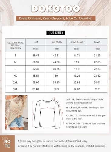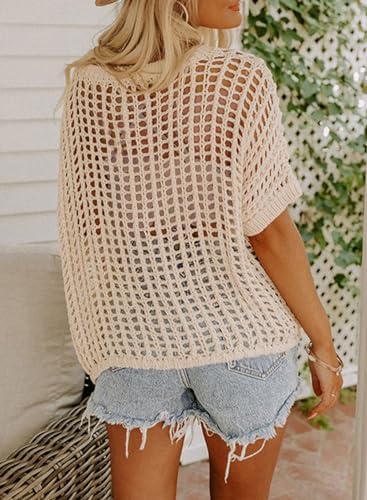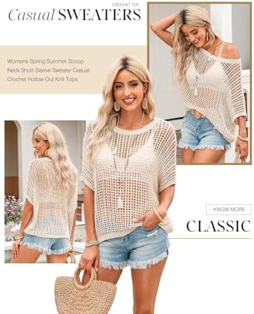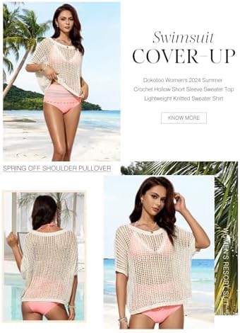 Features:Crochet Hollow Out,Short Sleeve,Scoop Neck,Solid Color,Lightweight Sweaters for Women, Women Knit T Shirts, Off Shoulder Tops, Swimsuit Coverup for Women, Bathing Suit Coverup for Women, Swim Coverup, Crochet Coverup, Beach Coverup,Resort Wear for Women 2024,Cruise Outfits for Women 2024,Unique Knitting Pattern, Loose Fit Pullover Top. Dokotoo Womens Spring Summer Scoop Neck Short Sleeve Sweater Casual Crochet Hollow Out Knit Tops Work Business Pullover Shirts Bathing Suit Coverup for Women Resort Wear for Women 2024 One piece cover up with hollow out fishnet, pull on, short sleeve, solid color, wide neckline design, you can wear it one shoulder, or up.Cute, Sexy, Charming. Occasion:Crochet Coverup for women is great for shopping, party, work, office, night out, date, vacation, everyday look, ect. Wash Recommended With Cold Water/Do Not Bleach/Hang Or Line Dry/Wash with like colours,that will increase the durability of your clothes.
