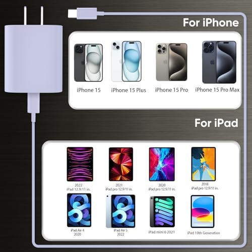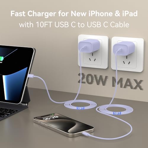 USB C i.Phone 15 Charger- The USB C power adapter use the PD 3.0 fast charging technology provides maximum 20W output power, fast charge i.Phone 15/15 Plus/15 Pro/15 Pro Max to 50~57% in just 30 minutes.    i.Phone 15 charger fast charging- 20W PD USB C wall charger plug fast charge for i.Phone 15/15Pro/15 pro max/15 plus. Please note this ONLY fit for the newest i.Phone 15 series, other old i.Phone models (i.Phone 14/13/12/11/X/8 series)will not compatible.    10FT Long i.Phone charger Cable- 10 FT extra long USB C to USB C cord equips automatic chip recognition function, full support with i.Phone 15 series. And the 10 foot (3meter) charging cable length allows you charge your i.Phone 15 and i pad models from extra long distance, makes your life more easier and convenient.    Superior Safety Fast Charging- 20W i.Phone 15 pro max charger provide intelligent circuit design to keeps your i.Phone 15 be safe from over-current over-voltage over-heating , short-circuiting, exhaustive protection while charging.    What You Get- 2 pack 10 foot C to C type fast charging cable, 2 pack USB-C i.Phone charger fast charging block! Long-time Worry-Free Friendly Support! If you have any questions, don't hesitate to contact us! We are at your service 24 hours!