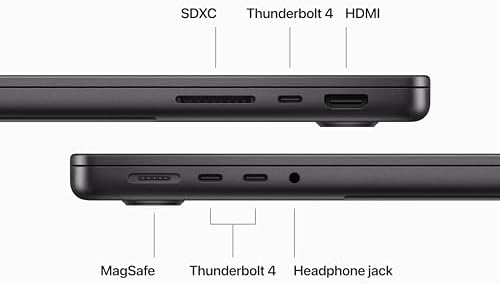 SUPERCHARGED BY M3 PRO OR M3 MAX — The Apple M3 Pro chip, with an up to 12-core CPU and up to 18-core GPU, delivers amazing performance for demanding workflows like manipulating gigapixel panoramas or compiling millions of lines of code. M3 Max, with an up to 16-core CPU and up to 40-core GPU, drives extreme performance for the most advanced workflows like rendering intricate 3D content or developing transformer models with billions of parameters.    UP TO 18 HOURS OF BATTERY LIFE — Go all day thanks to the power-efficient design of Apple silicon. The MacBook Pro laptop delivers the same exceptional performance whether it’s running on battery or plugged in. (Battery life varies by use and configuration. See apple.com/batteries for more information.)    BRILLIANT PRO DISPLAY — The 14.2-inch Liquid Retina XDR display features Extreme Dynamic Range, over 1000 nits of brightness for stunning HDR content, up to 600 nits of brightness for SDR content, and pro reference modes for doing your best work on the go. (The display has rounded corners at the top. When measured diagonally, the screen is 14.2 inches. Actual viewable area is less.)    FULLY COMPATIBLE — All your pro apps run lightning fast — including Adobe Creative Cloud, Apple Xcode, Microsoft 365, SideFX Houdini, MathWorks MATLAB, Medivis SurgicalAR, and many of your favorite iPhone and iPad apps. And with macOS, work and play on your Mac are even more powerful. Elevate your presence on video calls. Access information in all-new ways. And discover even more ways to personalize your Mac. (Apps are available on the App Store.)    ADVANCED CAMERA AND AUDIO — Look sharp and sound great with a 1080p FaceTime HD camera, a studio-quality three-mic array, and a six-speaker sound system with Spatial Audio.    CONNECT IT ALL — This MacBook Pro features a MagSafe charging port, three Thunderbolt 4 ports, an SDXC card slot, an HDMI port, and a headphone jack. Enjoy fast wireless connectivity with Wi-Fi 6E and Bluetooth 5.3. And you can connect up to two external displays with M3 Pro, or up to four with M3 Max. (Wi‑Fi 6E available in countries and regions where supported.)    MAGIC KEYBOARD WITH TOUCH ID — The backlit Magic Keyboard has a full-height function key row and Touch ID, which gives you a fast, easy, secure way to unlock your laptop and sign in to apps and sites.