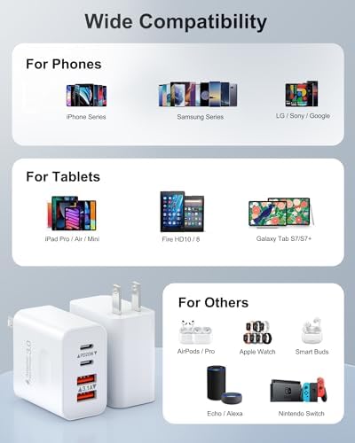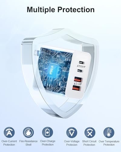 【2-Pack 40W Fast Charging Block】: The usb c charger supports the Power Delivery 3.0 and Quick Charge fast charging functions with a total power of up to 40W. The USB-C port supports a maximum power output of 20W. Charge your iPhone devices from 0% to 60% in just 30 minutes.    【USB C Wall Charger Multiport】: Upgraded USB C Charger Block has Dual USB-C ports and Dual USB-A ports. Allow users to charge 4 devices simultaneously to minimize waiting time. It’s also a great space saver instead of taking up 4 wall outlet ports. Say goodbye to your original usb charger.    【Universal Compatibility】: This usb c charging block is compatible with almost all electronic devices, charging adapter for iPhone 15/15 Pro/15 Plus/15 Pro Max/14/14 Pro/14 Pro Max/14 Plus/13/13 Pro/13 Pro Max/13 Mini/12/12 Pro/12 Pro Max/12 Mini/11/11 Pro/11 Pro Max/XS/XS Max/XR/X/8/8 Plus/7/7 Plus/6/6S/SE 2020, iPad Pro/Air/Mini, Apple Watch Series, Samsung Galaxy S23/S22/S21/S20/S10/S9/S7/A12/A13/A22/A32/A52/A53/Note 20 10/Z Fold 3, LG, Google Pixel, Kindle, Tablets, Switch and more.    【Safe and Reliable USB C Plug】: The c type charger block built-in safeguards protect your devices against short circuit, over-current, over-voltage, over-heating and over-charging. The usbc block will automatically stop charging when power is full to protect your device.    【Compact & Portable Design】: Incredibly compact size for enhanced portability. All this power comes installed in a pocket-friendly compact body, to go wherever the journey takes you. Ideal for home, office and on the go. 2-PACK DESIGN: One for travel and one at home, handling multiple devices conveniently.    ★★★★★【What You Get】: We provide this 2Pack 40W 4-Port USB C Wall Charger - White (cable not included) with 18 Months Worry-free Replacement and 24/7 Online Customer Service. If you have any problems, please contact us freely and we are always at your disposal.