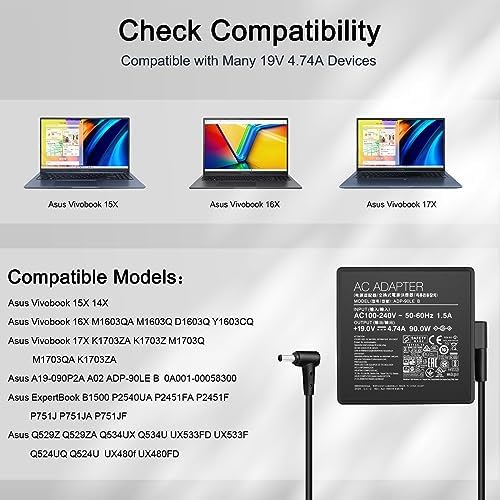 Connector Type : 4.5*3.0mm. Input: 100-240V 50-60Hz~ Output: 19V 4.74A 90W.    Compatible with P/N: P/N: Asus A19-090P2A A02 ADP-90LE B 0A001-00058300 ASUS 90W 4.74A Laptop Charger 4.5*3.0mm Connector . Asus ADP-90LE B adapter    Compatible with Asus ExpertBook B1500 P2540UA P2451FA P2451F P751J P751JA P751JF 90W Laptop Charger    Compatible with Asus Q529Z Q529ZA Q534UX Q534U UX533FD UX533F Q524UQ Q524U UX480f UX480FD 90W Laptop Charger. Asus Q524U charger, Asus K1703Z charger, asus vivobook 17x charger, asus vivobook 17x k3704 charger    Compatible with Asus Vivobook 17X K1703ZA K1703Z M1703Q M1703QA K1703ZA charger ASUS Vivobook 16X M1603QA M1603Q D1603Q Y1603CQ Power cord. ASUS Vivobook 15X 14X 16X 17X 90W Laptop Charger