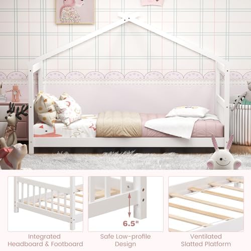 Fun & Playful Design: The charming house-shaped bed frame will inspire your child’s imagination and make bedtime more enjoyable. You can decorate the roof with pennant banners or other ornaments, making it the focal point of any kid’s bedroom.    Safe Floor Bed: The twin bed for kids features a low-bed design, ensuring a safe and secure sleeping environment. You can have peace of mind knowing that your child can easily get in and out of bed without the risk of falling.    Built with Solid Wood: The floor bed for kids is built with high-quality solid wood to ensure durability and stability. Plus, the sturdy plywood slats form a ventilated and supportive surface for mattress, no box spring required!    Spark Their Creativity: The platform bed offers not only a comfortable place to sleep but also a world of imagination. Your child will love playing, reading, and dreaming in their own little house, making bedtime an adventure every night.    Easy Assembly & Maintenance: With straightforward assembly instructions, you can quickly set up this twin house bed without any hassle. Its low maintenance design allows for easy cleaning and upkeep, making it convenient for busy parents.