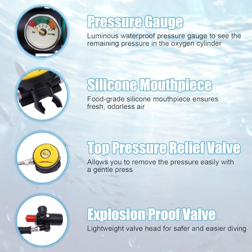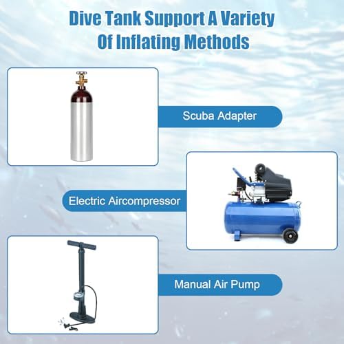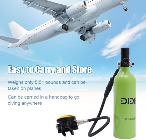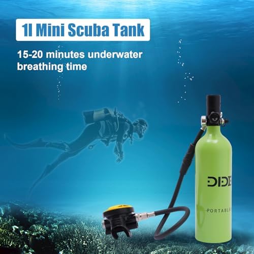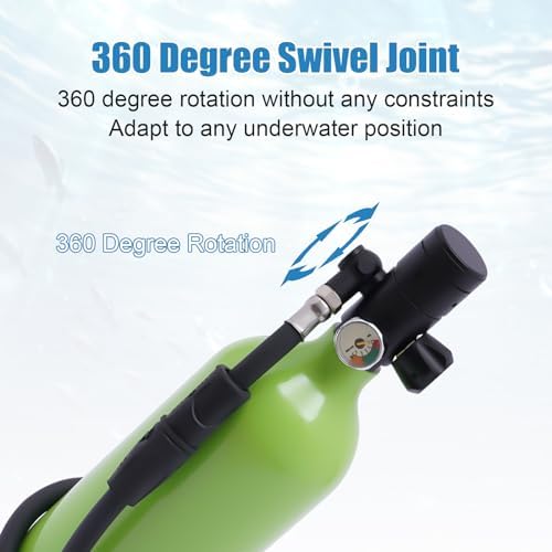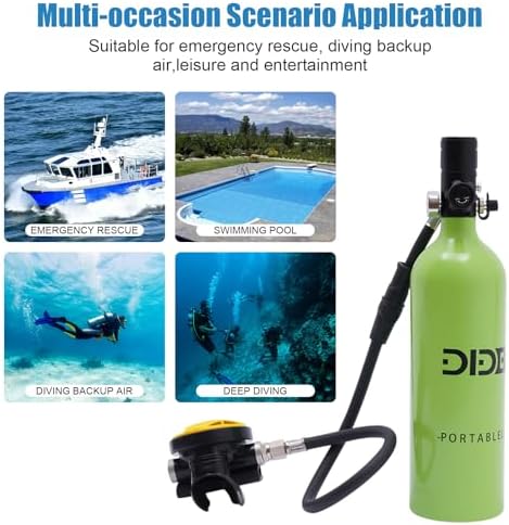 Portable Scuba Oxygen Bottle: 1L mini diving tank can let you enjoy a happy diving experience, the capacity of underwater oxygen breathing equipment is 0.9 quart, the scuba diving tank can let you stay underwater for 15-20 minutes and can be reused. With a capacity of 0.9 quarts, the scuba diving tank can keep you underwater for 15-20 minutes and is reusable, making it ideal for novice divers to experience the fun of scuba diving.    3 Inflating Methods: Dive portable lungs have three inflating methods, one can be inflated by high pressure hyperbaric cylinder (not included), the second can be inflated by scuba converter head, and the third can be inflated by electric inflatable pump (not included), which makes your scuba diving more convenient.Mini scuba tank is made of high quality aluminium alloy, which has good stability.    Safe and stable: Mini oxygen tank bottle has constant pressure air outlet device and high stability decompression system, make the air pressure constant.Scuba diving tank top pressure reducing valve can let you easily unload the pressure, gently press, explosion-proof valve design, lightweight valve head, let you dive safer and more easily.    Convenient Operation: Underwater oxygen breathing equipment has a valve control master switch, you can open the valve to keep the gas flowing when inflating and breathing, and close the valve to prevent leakage when not in use.Mini air tank360°swivel connector, you can adjust the direction of the medium pressure hose as you like to adapt to the dive position to prevent tangling and damage. High-quality zip ties make it easy to use.    Application Scenario: Scuba diving equipment is a unique gift for those who love to dive, and also a gift for various anniversaries or festivals. diving tank is suitable for professional divers, fishermen, novice divers, amateur divers, firefighters, lifeguards, etc. as an underwater emergency back-up or short-term dive equipment, holiday dives, river and sea emergency rescue, underwater exploration, ship cleaning, spare air source and so on.    What you get:The Perfect Dive Package includes 1*Mini Scuba Tank, 1*Carrying Strap1*English Instruction.