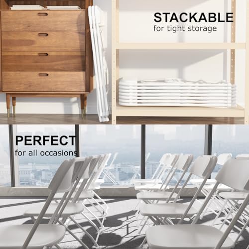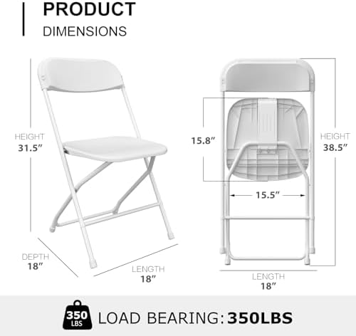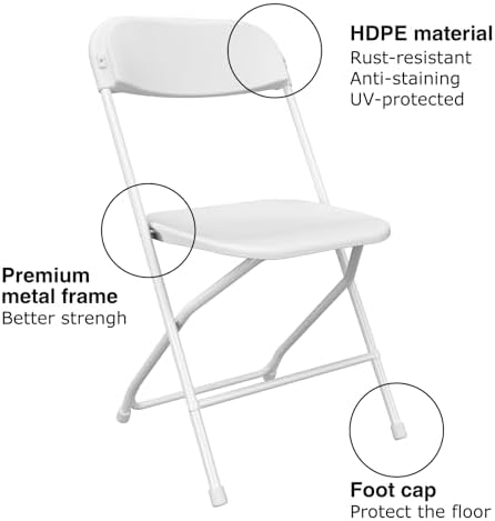 SET OF 10 FOLDING CHAIRS: Multipurpose 10-pack of white folding chairs are an indoor seating solution for banquets, gatherings, and dining - stylish, durable, and versatile.    DESIGN FOR LONG-TERM USE: The seat and back are made of thick HDPE, environmental and enough thick. The strong frame is with white coated, beautiful as well as stable. Weight capacity 350lbs. This chair will complement any decor it's steel frame means it will remain durable for years of use.    COMFORTABLE SEAT: Ergonomically designed folding chairs can give your back strong support and relief spinal pressure.    ANTISKID RUBBER FEET: Rubber feet keeps floor from damaging and help to keep the seat in place while minimizing scuffing. Our plastic folding chairs is quite suitable for your workstation to entertain your guests, which is also a good choice for parties and events in order to treat a large number of people.    PORTABLE LIGHTWEIGHT CHAIRS: No assemble needed, simply fold and unfold. Easy to open and close with seconds.They can be easily folded and stored away when not in use, saving you valuable space.
