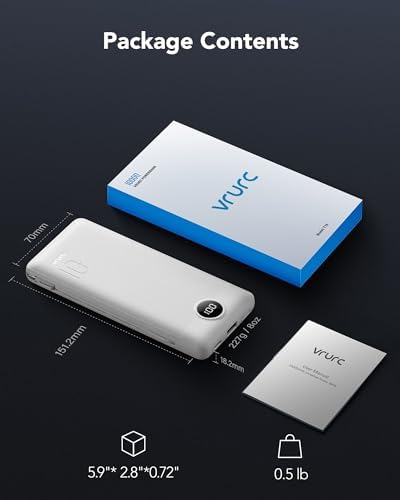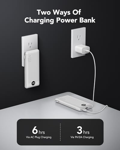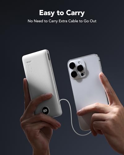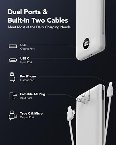 [Portable Charger With Built-in Cables & AC Wall Plug] This portable charger not only features built-in Micro, USB-C, and for iPhone charging cables but also includes USB and USB-C ports for added versatility. Moreover, the portable phone charger incorporates a built-in wall plug, enabling direct charging of the power bank from a wall outlet.    [Supports Up to 22.5W Fast Charging] This portable charger with cables supports 22.5W fast charging through its USB port. Additionally, it boasts built-in cables supporting PD 20W and QC 18W, ensuring efficient and rapid charging capabilities.    [Slim & Compact Design] With dimensions of 5.9 x 2.8 x 0.7 inches and a weight of 8 ounces, this product's slim and compact design enhances on-the-go convenience without adding extra weight.    [Smart Digital LED Display] The smart digital LED display provides a quick overview of remaining power. Additionally, the 3D texture on the surface enhances the tactile experience, offering a better 3D touch and grip to prevent slipping of the power bank and connected devices.    [Wide Compatibility] Utilizing the built-in charging cables, this portable battery charger is compatible with iPhones, Android devices, and most USB-C mobile phones and smart devices, catering to a wide range of daily charging needs. This external battery power bank meets the demands of various devices.    [Product Package] Each package includes 1 Power Bank and 1 User Manual, ensuring a hassle-free user experience.