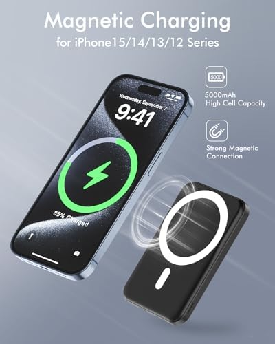 Great Compatibility: This magnetic power bank with the remarkable 5000mAh battery designed for iPhone 15, iPhone 15 Plus, iPhone 15 Pro, iPhone 15 Pro Max, iPhone 14, iPhone 14 Plus, iPhone 14 Pro, iPhone 14 Pro Max, iPhone 13, iPhone 13 mini, iPhone 13 Pro, iPhone 13 Pro Max, iPhone 12, iPhone 12 mini, iPhone 12 Pro, and iPhone 12 Pro Max. (Note: Need to be aligned with the magnetic suction, without cases or with mag-safe cases)    Strong Magnetic Wireless Charger: Mag-Safe battery pack with the newest magnetic technology (stronger magnetic and nano adsorption), can directly hold the back of your iPhone 15/14/13/12 Series,providing up to 15W wireless charging. With the mag-safe power bank you can charge your phone anytime and anywhere, without the hassle of wires, perfect for travel, vacation and camping;    Extremely Compact Design: This magnetic portable charger iphone fits easily into your pocket, even while wearing skinny jeans. Due to its compact size of 3.74*2.55*0.55 inches, it will not block the camera. The lighter weight(olny 120g) allows you to use it with iPhone gently;    Fast Wireless & Wired Charging: Support 5W, 7.5W, 10W and 15W Max wireless charging and max 20W USB-C output; support max 12W Lighting input and max 18w USB-C input; The wireless charger can charge 2 Devices at the same time, shared charging with no waiting. And the portable charger iPhone uses soft silicone material to protect your phone from damage while wireless charging; The magnetic portable charger for iphone ensures faster charging speeds;    Superior Safety: With 8 built-in low-temperature ice cores, this latest Podoru magnetic power bank has comprehensive multi protect safety system specifically includes temperature control, overcharge protection, short circuit protection;Multi-Protect safety system ensures that your devices are shielded from potential hazards, providing you with a worry-free charging experience;
