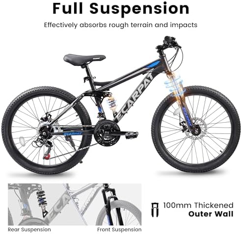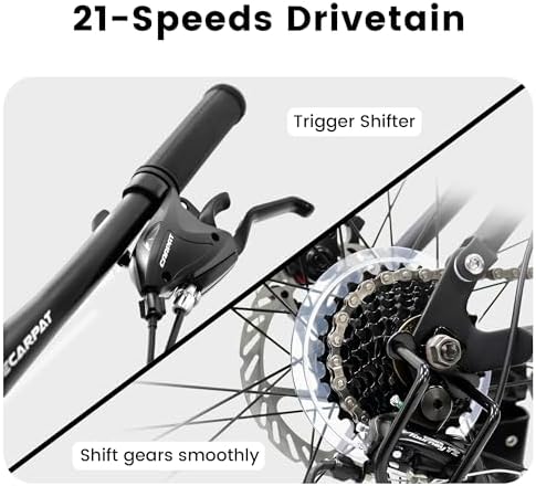 【Durable Steel Frame】26x17 inch sturdy and durable steel frame, provide safe and stable cycling experience. Ergonomically design, suitable for mens womens height 4'9"-5'3"(57-63 inches), max weight is up to 250lbs.    【21-Speed with Disc Brakes】Grip Shifter help to switch gears with smoothness. Simple operation allows for quick selection of gears for various terrains. Mechanical dual disc brake system, simple structure and convenient for maintenance.    【Front Fork+Shock Absorber】These all-terrain MTB feature shock-absorbing front and rear shock absorber. Dual shock absorbers provide double shock absorption effect, allowing you to ride smoothly and comfortably. The parallel bars can adapt to pressure road conditions.    【26*2.125" All-Terrain Tires】Made of high quality rubber, all-terrain tires with strong puncture ressistance soften the bumps and stick to the Dirt, Trail, Gravel, Paved Path for a smooth, stable ride: strong grip, have a super excellent anti-skid function and is not easy to slip.    【85% Pre-Assembled】The bike comes 85% pre-assembled. You need to assemble the handlebar, saddle, front wheel and pedals. After a short adjustment of the brakes and gears you can start riding immediately. Please note that if you have any questions, you could contact our customer service first.