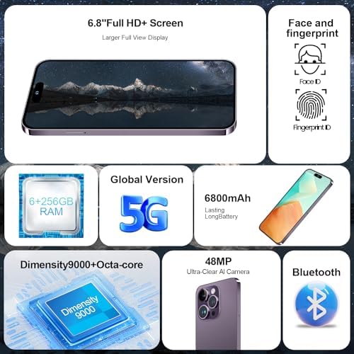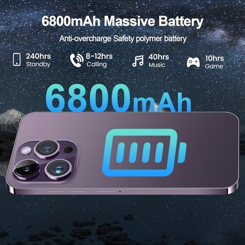 【6800mAh large battery】 The cell phone is equipped with a large 6800mAh battery, saying goodbye to battery anxiety. When you are still worrying about batteries, please choose it! Trust me, you don't need to charge it all the time, because its battery is very big enough for you to use, and it is enough to meet your daily needs! you can immerse yourself in everything this phone has to offer without constantly worrying about charging. Whether you're on a long road trip, exploring new places, or just making it through a busy day at work, this powerful battery ensures your smartphone stays charged when you need it most.    【6.8 HD+ for Android 13.0】Please note that this is an Android phone with a large perforated screen, 2.5D curved edges, and a premium heat bending glass back cover. 5-point capacitive touchscreen. Magnesium aluminum body. Facial recognition, on-screen fingerprint unlock to protect your privacy. comfortable to hold. Adopts facial recognition and on-screen fingerprint unlocking to better protect your privacy.    【Excellent camera features】 Unlock your photography potential with our smartphone’s powerful 48MP+108MP dual camera setup. helping you capture and record the most exciting memorable moments with high-quality images or videos, perfect for indoors outdoors. From stunning landscapes to intimate portraits, this camera system allows you to be creative and record life's precious moments with extraordinary clarity. Say goodbye to blurry, low-quality photos - with this smart phone you can capture and share high-resolution images that are truly eye-catching. Let your photography skills shine with the exceptional features of our smartphone dual camera setup.    【Global band and dual SIM 5G mobile phone】This machine adopts 5G smartphone 5G smartphone has faster transmission speed, short time delay, high positioning accuracy, wide link for customers to feel a more advanced experience. experience.    【Cell Phones+Giveaways】You'll receive not only the A15ProMax phone but also a box, a user manual, a charger adapter, a USB C data cable, a pair of headphones, a protective screen and a case