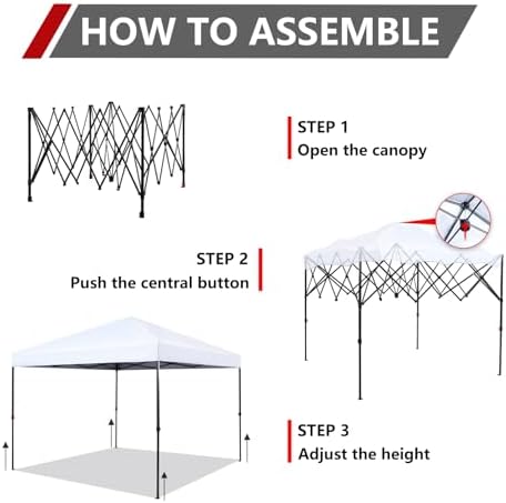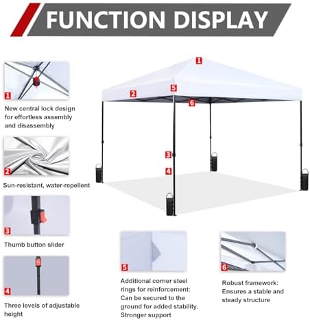 Effortless Assembly:Featuring patented one-push center lock technology, this canopy sets up in seconds with a single push. Soft pinch-free buttons enable easy adjustment of leg height, requiring no tools for setup. Designed for quick assembly by two individuals, it's a breeze to set up. Enhanced UV Protection: Our upgraded fabric is UV coated to reflect 99% of harmful sun rays, providing superior sun protection for you and your loved ones. Additionally, its water-resistant properties ensure that you stay dry and comfortable, even in light rain showers. Corrosion-Resistant Frame:Constructed from durable, high-grade, corrosion-resistant steel truss with hardened through bolts, this frame is pre-assembled and tool-free to install. Three-section adjustable height:Enhanced toggle leg adjustment ensures pinch-free operation and effortless unlatching. Select from three height settings to match your requirements. Perfect for camping, festivals, tailgating, backyard gatherings, and beyond. Dedicated After-sales Support:At StarEcho, we're committed to exceptional customer service. Contact our team for any questions or concerns about your hardtop gazebo. From assembly to maintenance, we ensure your complete satisfaction with your purchase, providing years of outd